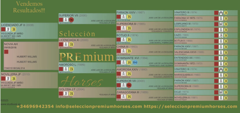Jej wybitny i niezwykle utytułowany sportowy rodowód czyni ją również interesującą dla hodowców. Novia AH pochodzi z naszego własnego programu hodowlanego. Jej ojciec i matka zostali wyhodowani przez znanego i wielokrotnego mistrza Europy Yeguada JF Mino z Alicante. Jej dziadkowie i pradziadkowie zostali wyhodowani przez niezwykle utytułowanego hodowcę i wielokrotnego mistrza świata Jose Luisa de la Escalera.