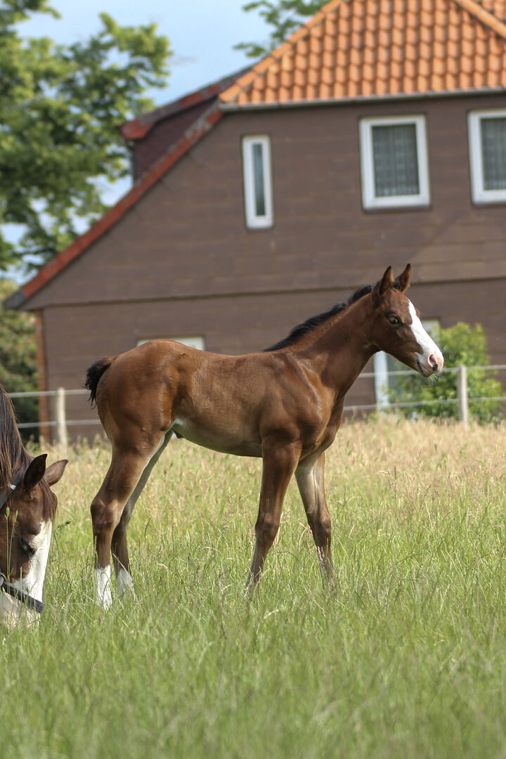 Piękna klacz rasy Quarter Horse z dobrymi chodami - Lokalizacja: 29221 Celle God Loves Chocolate - ta elegancka klacz rasy Quarter Horse, urodzona 6.2025 r., o szacowanym ostatecznym wzroście 150 cm, przyciąga wzrok dużą ekspresją i prezencją. Ma prawidłową, dobrą budowę, jest dobrze umięśniona i niezwykle wysportowana. Zdrowa i witalna, jest zaszczepiona i odrobaczona zgodnie z jej wiekiem w momencie przekazania. Schoki dorasta w małej grupie klaczy i źrebiąt, jest trzymana w otwartych stajniach i na łąkach i jest dobrze zsocjalizowana. Jest bardzo zorientowana na ludzi, ciekawska, przytulaśna, przyjazna, otwarta i zainteresowana. Jest łatwa w obsłudze, zrelaksowana, chętna do nauki i porusza się płynnie. Szczególnie imponujące jest jej piękne pokrycie terenu i świetne podwozie. Oznacza to, że dobrze poradzi sobie również w rekreacji. Schocki będzie prawdziwym wszechstronnym koniem EWU. Hancock spotyka cowhorse'a - udany outcross, który naprawdę przekonuje. Będzie sprzedawany z papierami AQHA, a kliniczne AKU zostanie zamówione przez hodowcę w ramach sprzedaży. Niezależnie od tego, czy chodzi o sport, zawody czy rekreację - ten źrebak jest wszechstronny i uszczęśliwi również jeźdźca rekreacyjnego o wysokich wymaganiach.