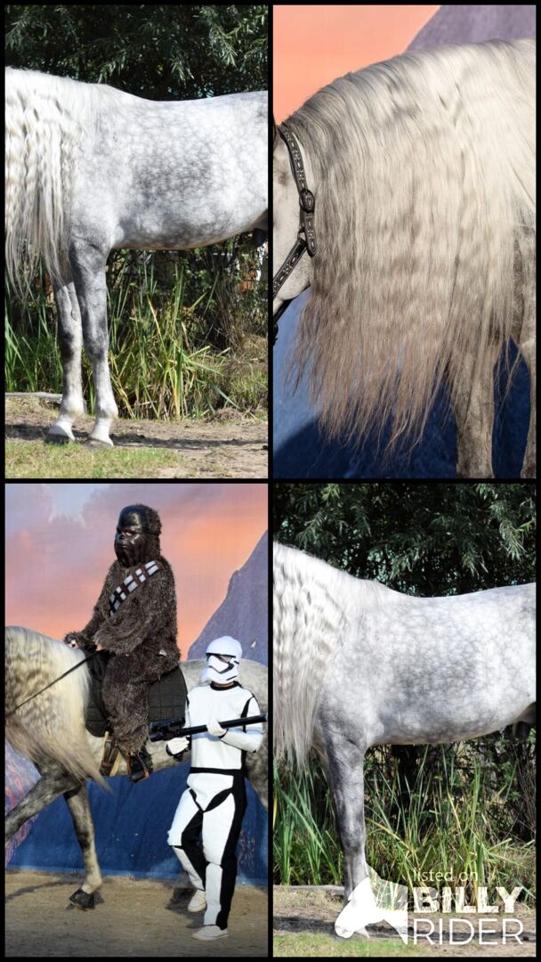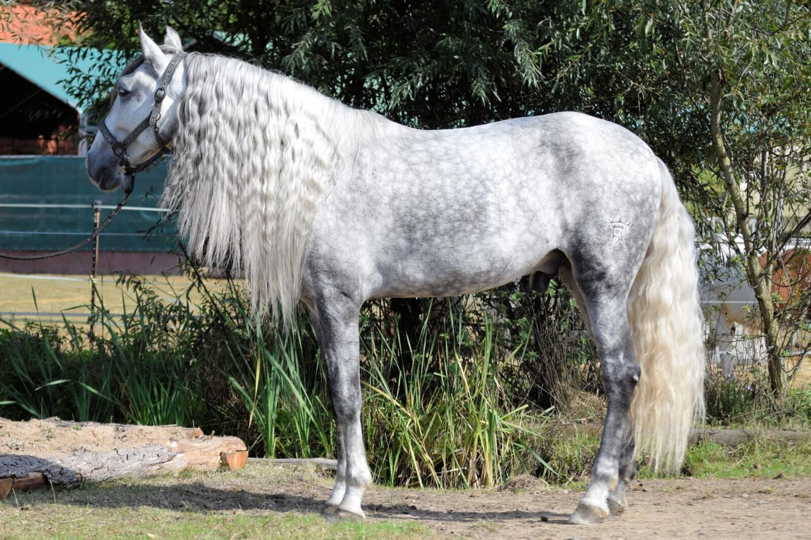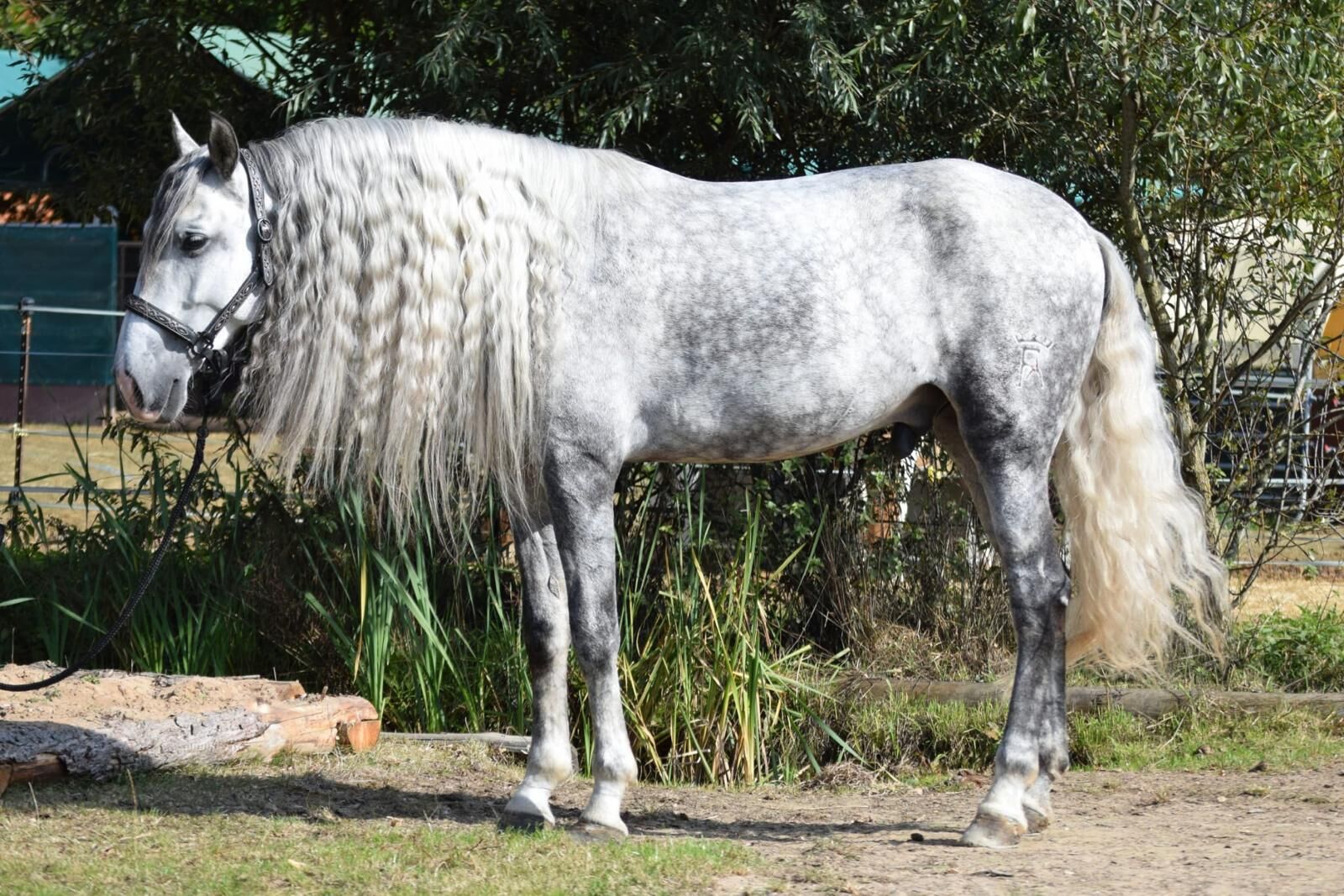 Wspaniały andaluzyjski wałach zachwyca nie tylko swoim wyglądem, ale także absolutnie uroczym charakterem. Urodził się w 2019 roku i ma 160 cm wzrostu. Jego długa grzywa sprawia, że przyciąga wzrok. Wałach charakteryzuje się również absolutnie spokojną naturą, jest niesamowicie dobrze wychowany i całkowicie nieustraszony. AKU z promieniami rentgenowskimi jest dostępne. Ma solidny trening i jest obecnie ujeżdżany. Pod siodłem potrafi wykonywać ruchy boczne itp. i obecnie pracujemy nad komplementem i hiszpańskim spacerem w ręku. Jest świetny w terenie i nadaje się do jazdy po drogach. Pozwolono mu również wziąć udział w pokazie koni i był fajny i bezproblemowy. Nadawałby się również dla słabych jeźdźców. Wałach jest bardzo wygodny w jeździe. Nadaje się również do pracy w jeździectwie. To świetny koń dla całej rodziny.