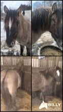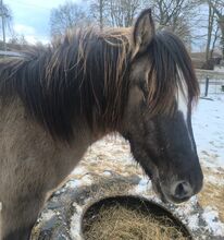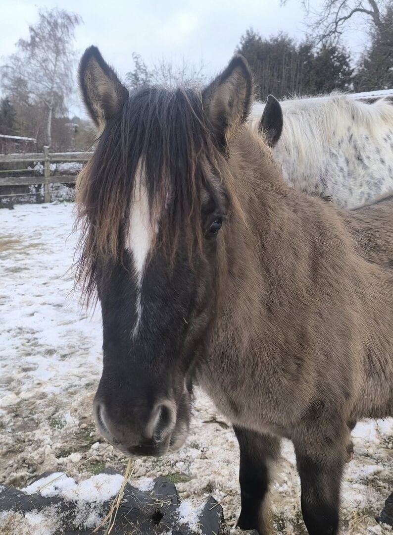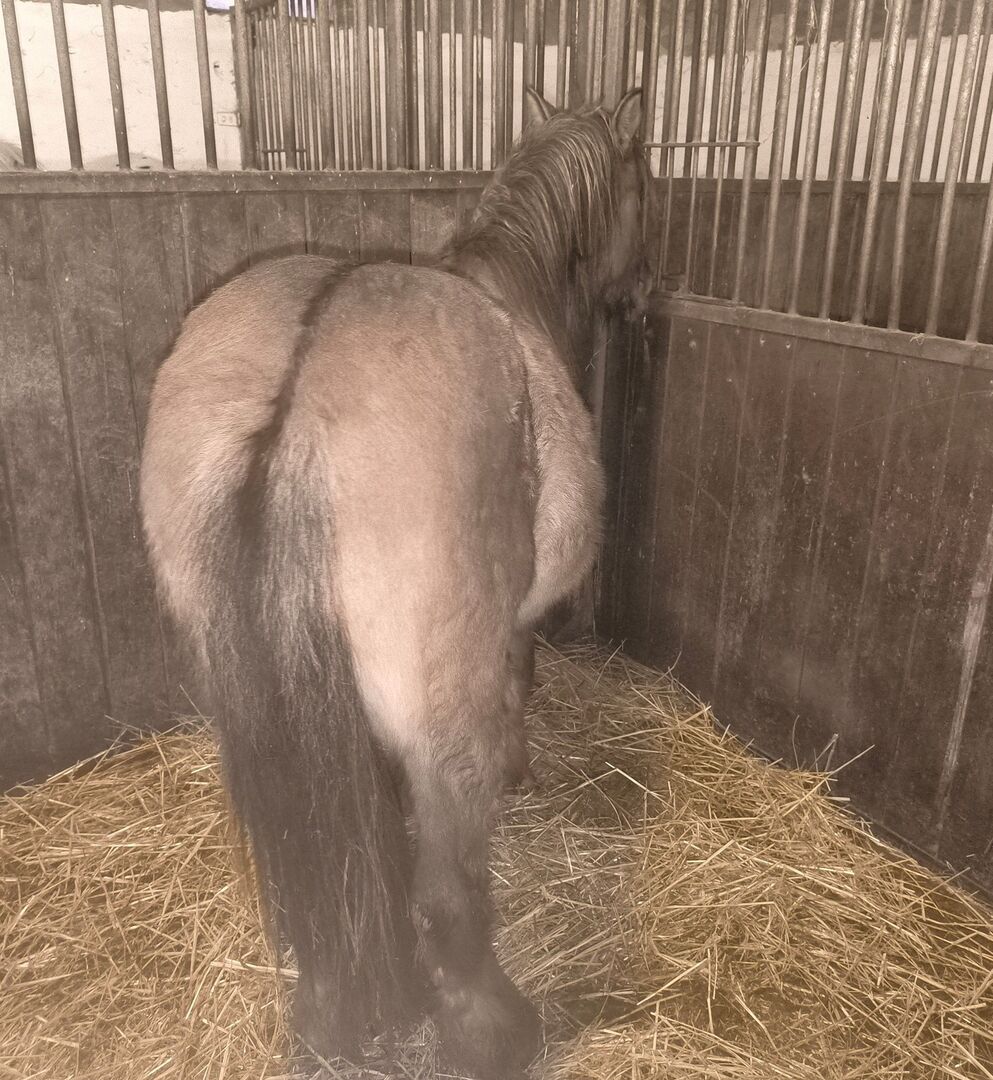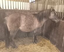 Piękny jastrząb ciemnej myszy - Źrebak Tinker w pięknym specjalnym kolorze Grisu * 5/24 ma papiery jako ICC z ICS NL jego EM wyniesie około 1,46 -1,48 m, jest bardzo silny z piękną dwukolorową prążkowaną grzywą i sierścią. Bardzo dobra budowa ze świetną górną linią, ciemną szykowną głową, czarnymi obwódkami uszu. Obecnie ma 134 metry wzrostu i 1,38 metra nadbudowy z tyłu (patrz zdjęcie 4), ponieważ obecnie ponownie rośnie. W świetnym kolorze mysiego płowego, latem ma również czarne paski zebry na nogach. Grisu jest bardzo słodki i ciekawski, bardzo zorientowany na ludzi, regularnie odrobaczany, umie jeździć przyczepą, chodzić na spacery w terenie, a czasem zostaje sam w stajni i wychodzi sam, dobrze zachowuje się u kowala.
