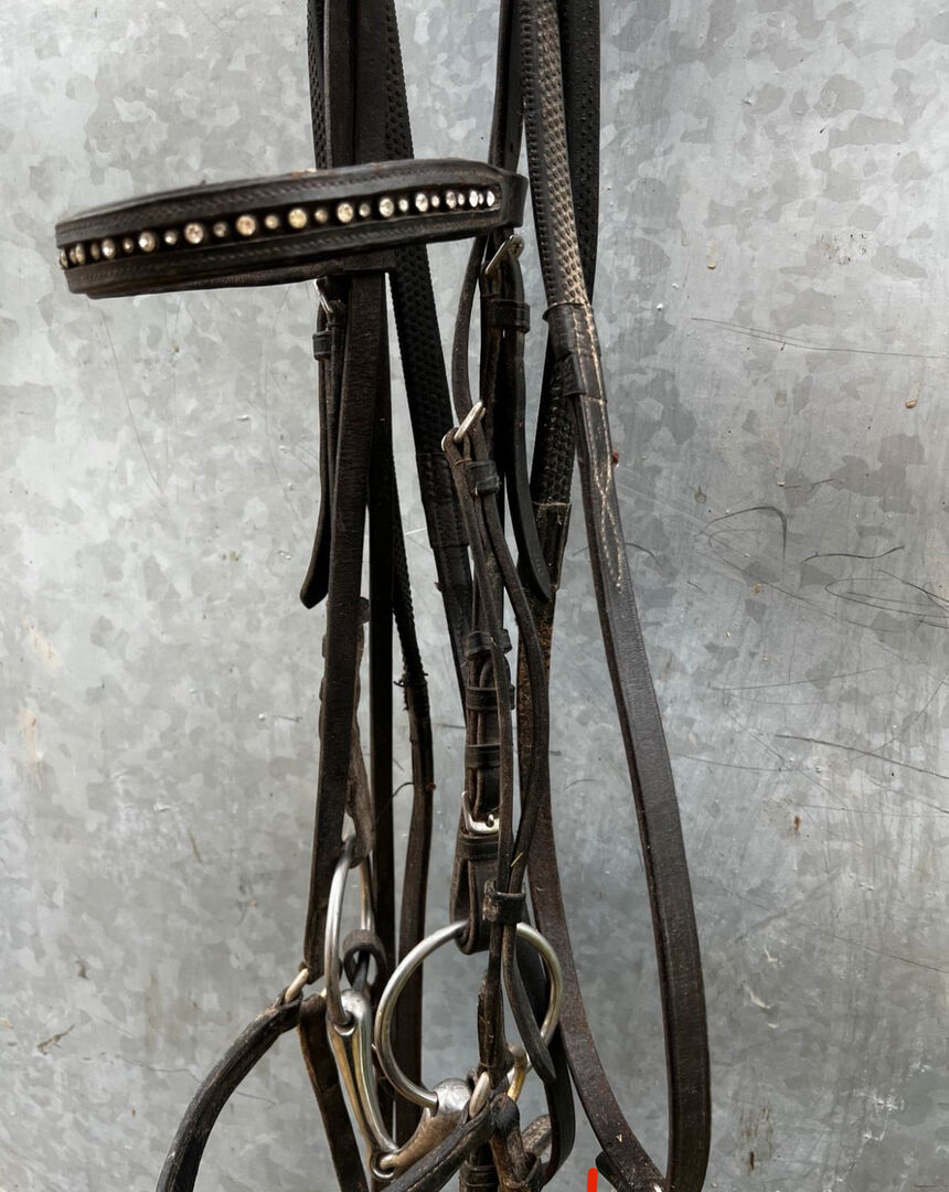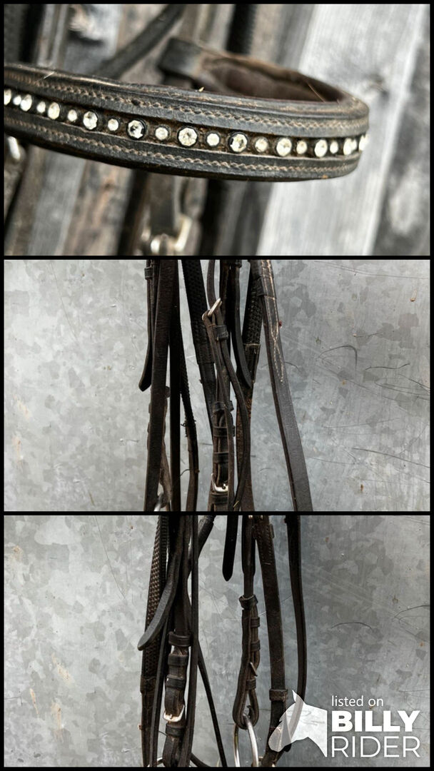Piękny snaffle z lejcami COB - Oferuję na sprzedaż bardzo ładną, zadbaną uzdę. Jest czarna i wykonana z bardzo wytrzymałej, miękkiej skóry. Uzda jest sprzedawana z wędzidłem i wędzidłami. Jest to rozmiar COB.