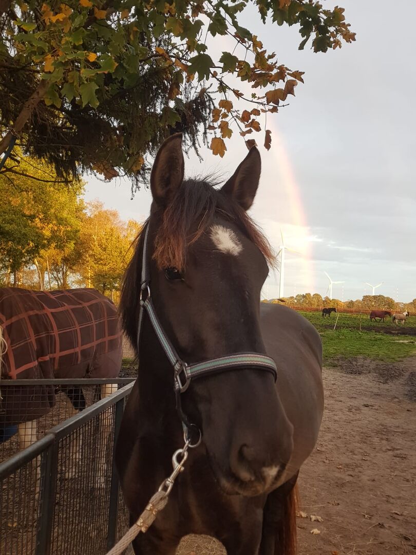 Piękny wałach - Ten wspaniały wałach był nie tylko skarbem, gdy zaczęliśmy na nim jeździć, ale pozostał nim do dziś. Uczy się bardzo szybko i szczególnie lubi pracę w terenie, gdzie zwraca szczególną uwagę na jeźdźca. Do tej pory pracował na lonży i jeździł ujeżdżenie. Jazda w terenie nie stanowi dla niego żadnego problemu. Pozwolono mu już na wykonywanie małych skoków pod jeźdźcem. Latem jego sierść nabiera pięknego połysku.