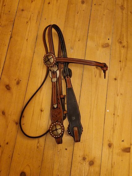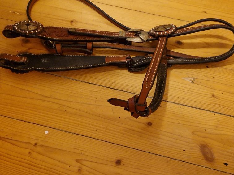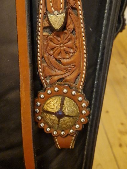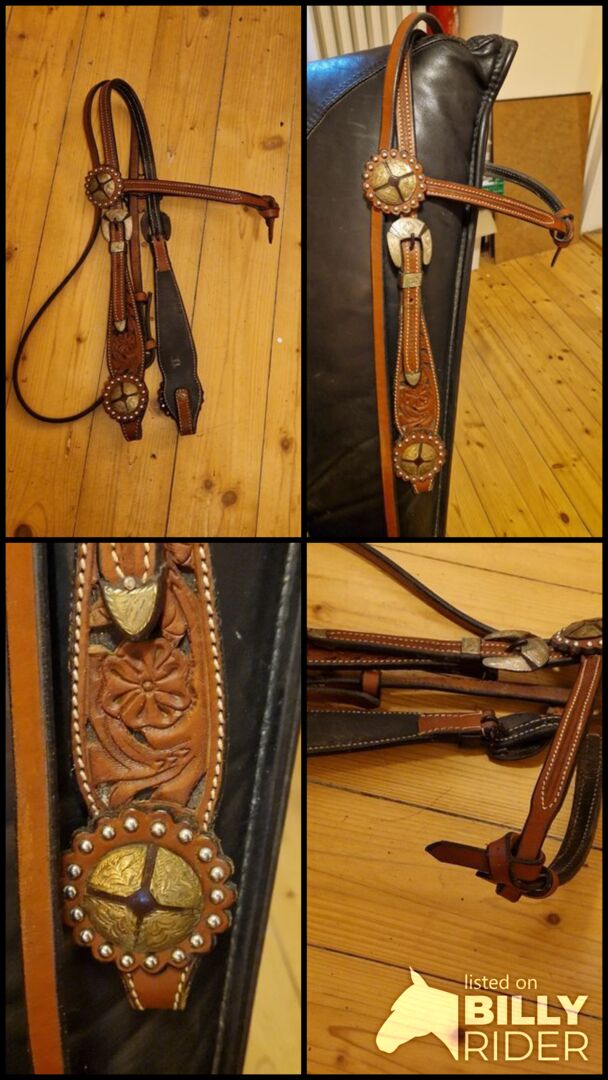 Piękny westernowy snaffle z konchami - Bardzo piękna uzda westernowa z wytłoczonym kwiatowym wzorem w skórze. Dobra, mocna skóra w ciepłym brązowym kolorze. Wszystkie sprzączki są w dobrym stanie.