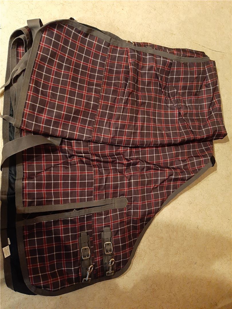 Piękny wzorzysty koc zimowy z polaru, świeżo wyczyszczony+impregnowany - Sprzedam ciepły koc zimowy z podszewką z polaru, w świetną kratę, patrz zdjęcie. Derka była noszona tylko kilka razy, ponieważ mój koń nie lubi derek. Z klapką na ogon i wyściełane w kłębie, aby zapobiec punktom ucisku, wszystkie zapięcia są nieuszkodzone. Koc został świeżo wyczyszczony i zaimpregnowany (w profesjonalnej pralni chemicznej), a następnie bezpośrednio "zabalsamowany". Mimo to, na kocu nadal jest kilka włosów ;) Długość tyłu wynosi ok. 155 cm plus klapa na ogon. Wysyłka jest możliwa po opłaceniu kosztów przesyłki (ok. 7 euro za paczkę DHL).