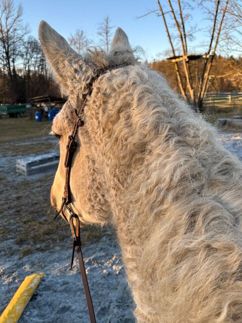 Piękny, zorientowany na człowieka wałach rasy Curly Horse - Mio to bystry, zorientowany na ludzi wałach, który nie tylko imponuje swoją rzadką rasą, ale także przyjazną naturą i chęcią do nauki. Ma solidne podstawowe wyszkolenie i został już ujeżdżony w stylu western. Jego trening wciąż się rozwija - jest idealny dla doświadczonych jeźdźców, którzy lubią zachęcać i cierpliwie towarzyszyć młodemu koniowi. Początkowo był ujeżdżany w profesjonalnej stajni westernowej przez doświadczonego trenera.