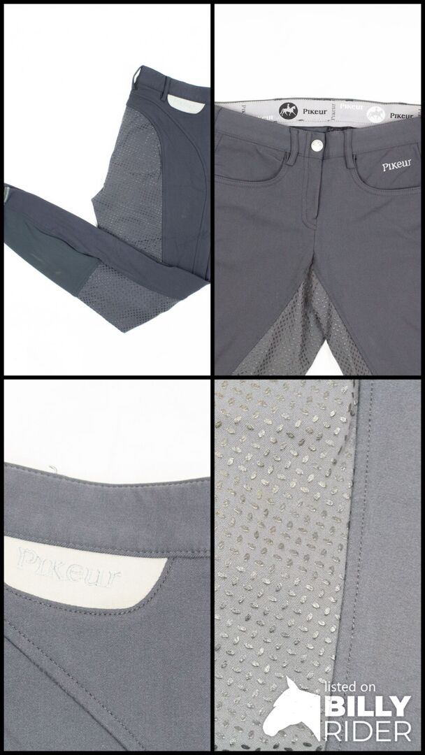 Pikeur Ladies Grip Full Seat Breeches "Ophira Grip" dark shadow 36 - Piękna i nowoczesna para bryczesów damskich Pikeur Grip w kolorze szarym. Spodnie wykonane są z 66% bawełny 27% poliamidu i 7% elastanu. Są one w rozmiarze 36 i mają dwie kieszenie z przodu. Mnóstwo pięknych detali na spodniach sprawia, że są one prawdziwym, ale klasycznym elementem przyciągającym wzrok. Posiada tonowe wykończenie uchwytów 3/4, które obiecuje optymalne wsparcie w siodle. Mają praktyczne elastyczne mankiety nogawek i można je prać w temperaturze 30°C. Bryczesy są tak dobre jak nowe. To the seller's offerlaunch