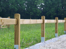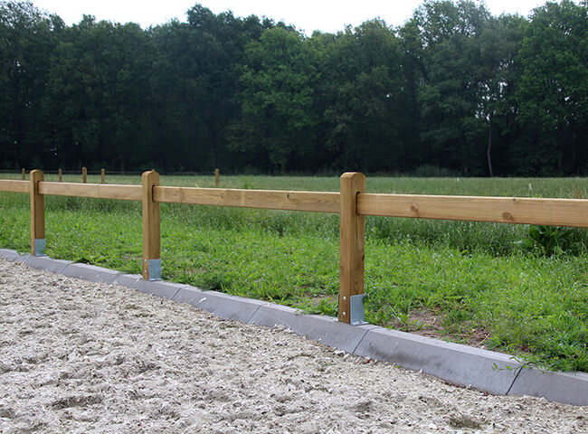 Stała arena wykonana z drewna - Dostępna z magazynu - Stabilna konstrukcja - Całkowicie zagruntowana za pomocą Tanalith-E - Możliwość montażu na drewnianych/betonowych belkach (podkładki dostępne za dodatkową opłatą) lub na ziemi - Pale: 80 x 10 x 10 cm | Zaunlatten 250 x 2,8 x 12 cm | Rozstaw pali: 2,5 metra