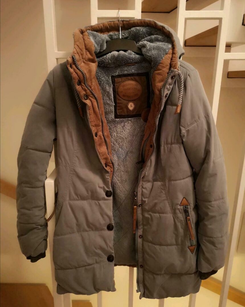 Płaszcz | Naketano | Futro pluszowe | Kaptur | Zima | L - Sprzedam przytulny, ciepły płaszcz Naketano z pluszowym futerkiem i kapturem.... Przyciąga wzrok dzięki skórzanym aplikacjom i szaro-niebieskiemu kolorowi....