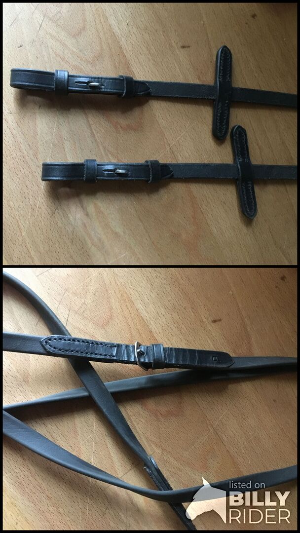 Płozy wykonane z biotanu/skóry o długości 260 cm - Jak nowe, antypoślizgowe wodze wykonane z biotanu, dwa razy po 130 cm. Końce wodzy i łączenie są obszyte skórą. Wodze były używane tylko trzy razy