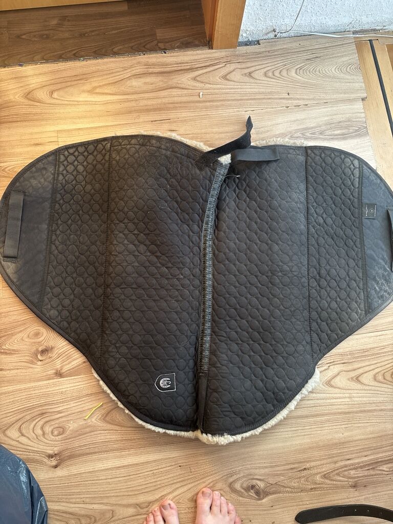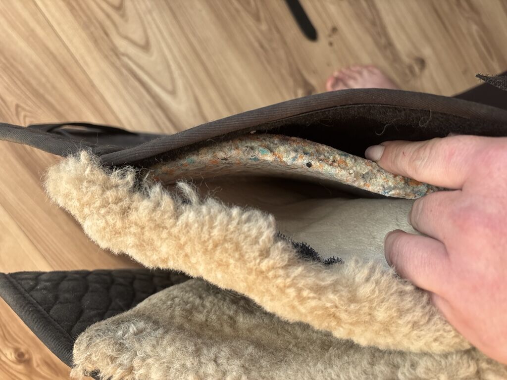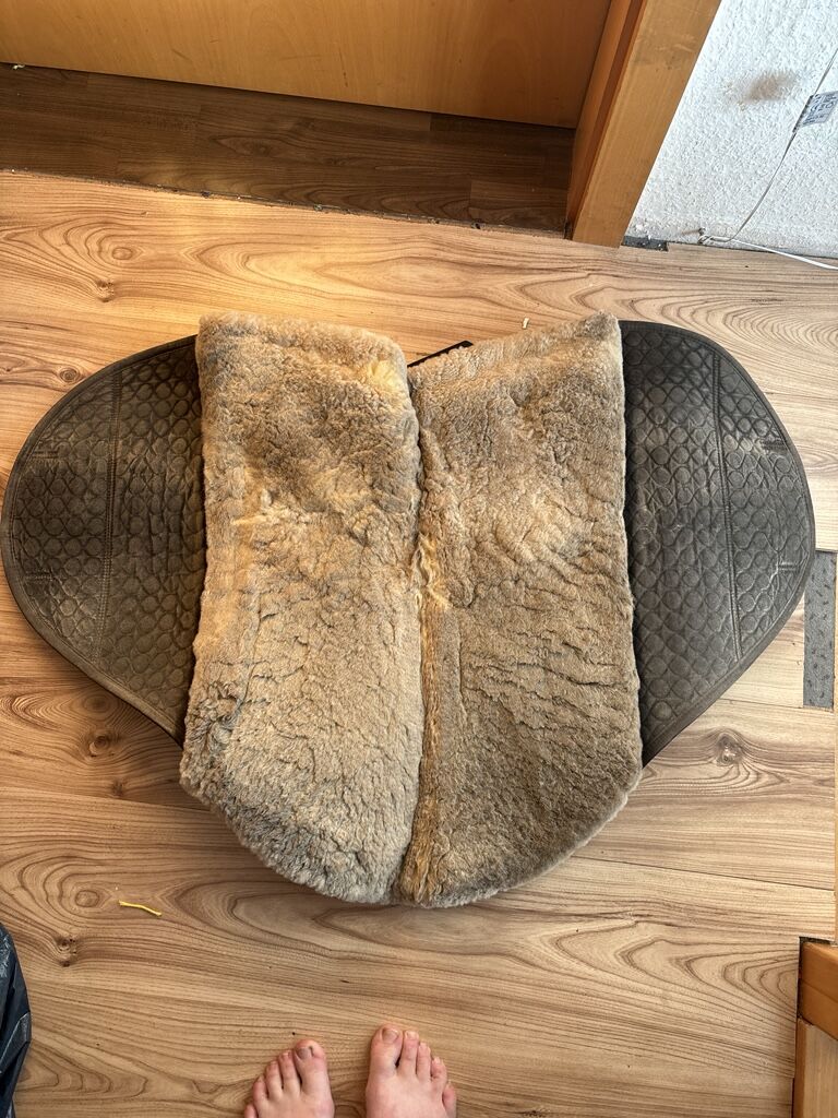 Podkład ze skóry jagnięcej Christ Cloud - Na sprzedaż jest używana, ale dobrze zachowana podkładka ze skóry jagnięcej pod siodło Christ Cloud, w tym wkładki z gumy piankowej, które można w razie potrzeby wymienić, aby dostosować siodło.