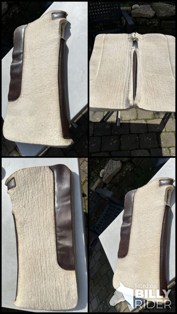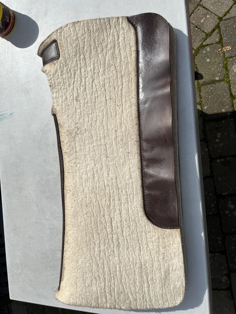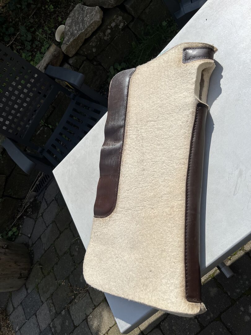 Wysokiej jakości filcowy ochraniacz westernowy wykonany z wełny merynosów z wgłębieniem na kłąb i skórzanymi wykończeniami. Trwały i amortyzujący wstrząsy. Długość 78 cm, grubość 2,5 cm.