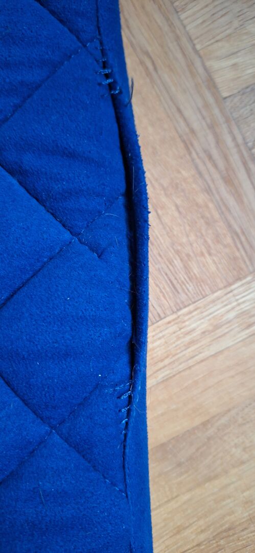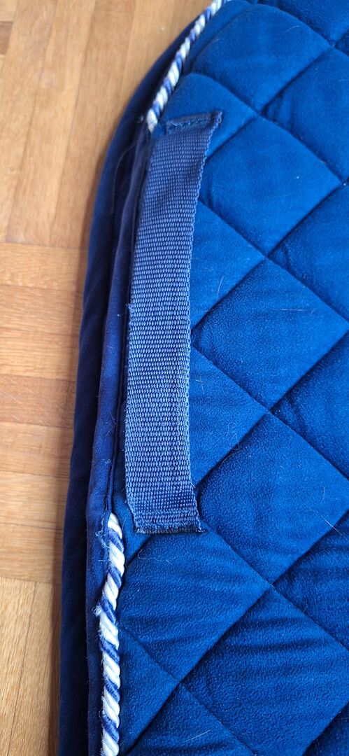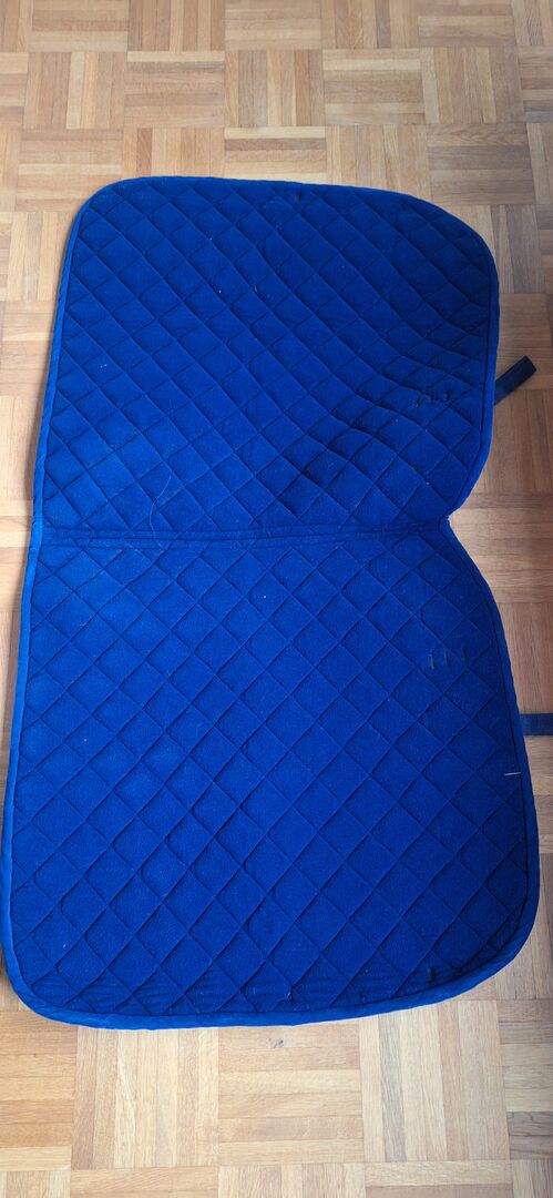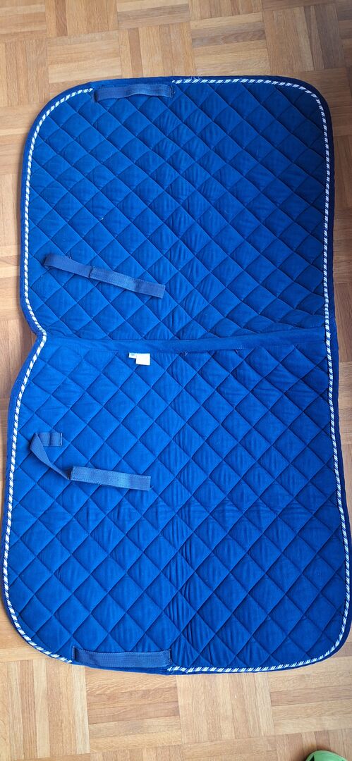 Podkładka pod siodło - Ciemnoniebieski pad pod siodło z biało-niebieską lamówką. Ujeżdżenie Szerokość 63 cm Długość 59 cm Górny szew otwarty. Zobacz zdjęcie Poza tym stan bardzo dobry. Sprzedaż prywatna bez gwarancji i bez możliwości zwrotu