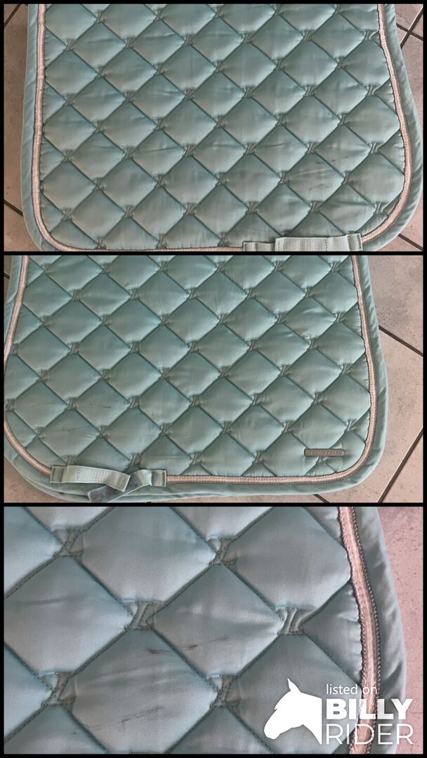 Sprzedaję piękny pad pod siodło w kolorze turkusowym, niestety w 2 miejscach (patrz zdjęcie) na siodle są czarne przebarwienia, nie jestem pewna czy można je wyprać.