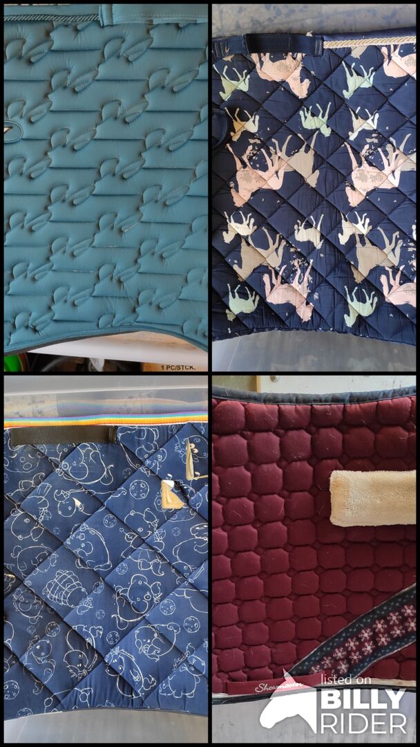 Podkładka pod siodło - Niebieski pad DR mało używany 15€ Podkładka pod siodło VS Christmas w kolorze czerwonego wina, mało używana 15€ Podkładka pod siodło Pummeleinhorn VS małe rozdarcie 10€ Granatowa podkładka pod siodło VS z różowymi i turkusowymi motywami koni 5€
