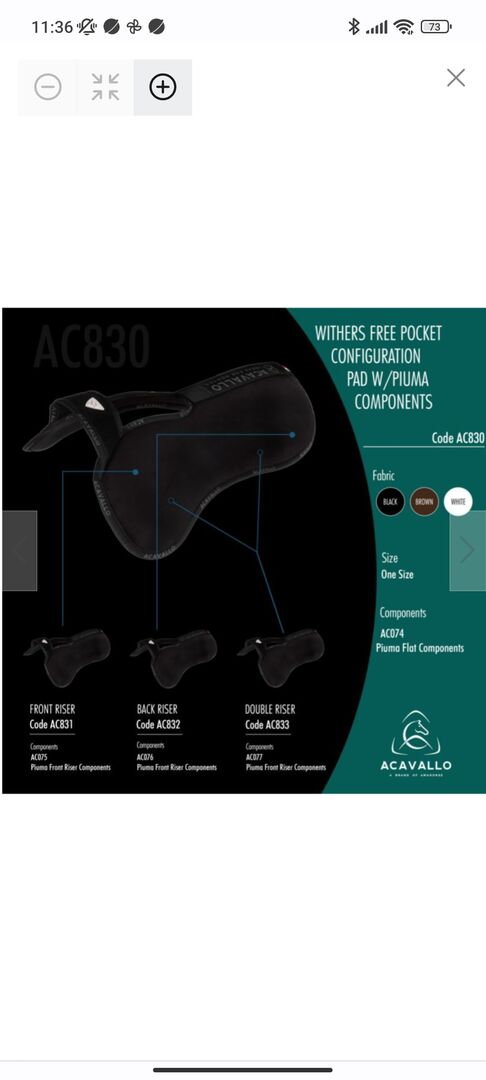 Acavallo Withers Free Pocket Configuration Pad z Piuma Pad jest przeznaczony dla koni z bardzo wyraźnym kłębiem i może być ułożony z 4 zestawami wkładek Piuma EVA. Idealny dla młodych koni, które ostrożnie rozwijają swoje mięśnie lub po prostu dla koni o określonej strukturze mięśni. Kieszeń umożliwia umieszczenie najbardziej odpowiedniej wkładki dla potrzeb konia, dzięki czemu siodło zawsze znajduje optymalną pozycję. Dostępne są 4 rodzaje wkładek: - STRAIGHT (AC830) - FRONT RISER (AC831) - TYLNY PIONOWY (AC832) - PRZÓD I TYŁ (AC833)