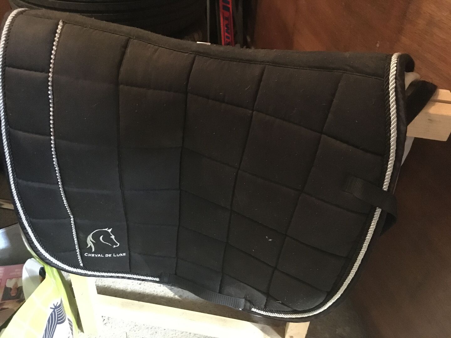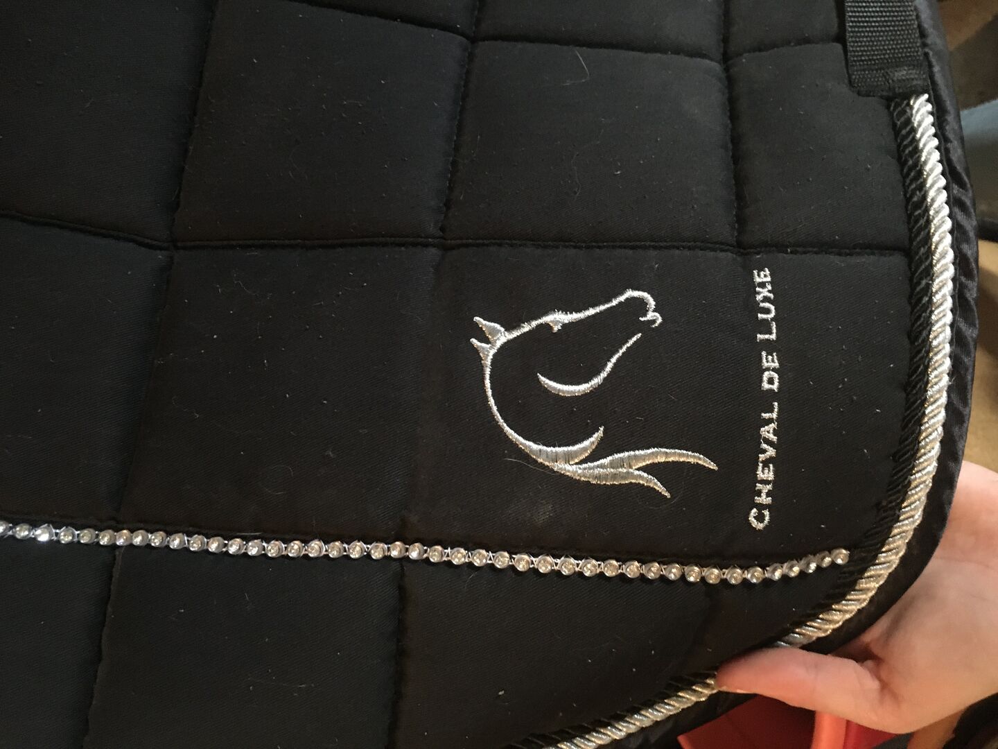 podkładka pod siodło cheval de luxe - Sprzedam moją czarną podkładkę pod siodło cheval de luxe z błyszczącymi kamieniami, była tylko 2-3 razy pod pasem/bezrękawnikiem, dostałam ją w prezencie i teraz już jej nie potrzebuję, rozmiar wb/dressage