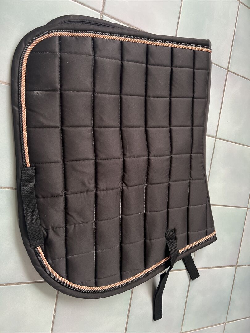 Podkładka pod siodło Cheval de luxe eventing w kolorze czarnym z różanym sznurkiem na brzegu + haft. - Otrzymany jako prezent. Nieużywany. Wyprany ręcznie 1 raz. Już mi się nie podoba.