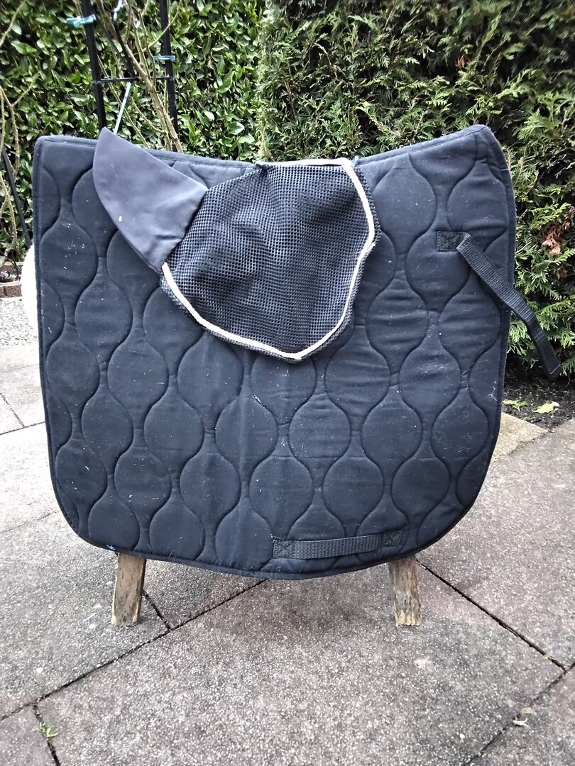 Podkładka pod siodło Dressage WB Set z nakładką na uszy - Nieużywany ochraniacz na siodło w kolorze czarnym w zestawie z pasującym nausznikiem. Lekkie ślady użytkowania wynikające wyłącznie z przechowywania. Cena wraz z wysyłką