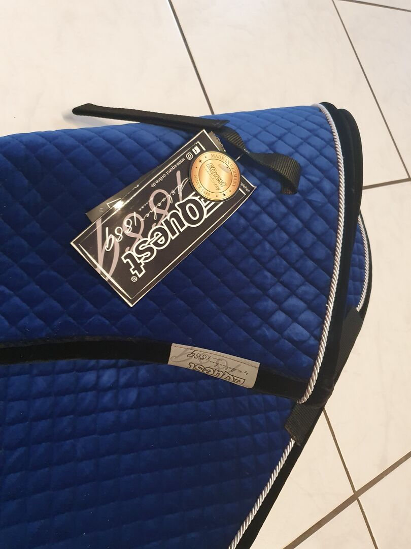 Podkładka pod siodło Equest Dressage Saddle Pad Velvet Royal Blue New - Oferuję nową aksamitną podkładkę pod siodło firmy Equest w kolorze royal blue z czarną obwódką i jasnoszarym ozdobnym sznurkiem. Wykonany jest z wysokiej jakości i świetnie się go czuje, spód jest przyjemnie chropowaty. Kupiłam go kiedyś na specjalne okazje, nigdy nie był używany i pewnie nie będzie, więc może iść dalej.