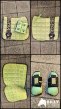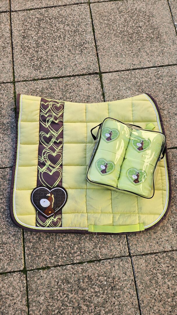 Podkładka pod siodło Eskadron DL Nici bandaże + getry - Sprzedaję podkładkę pod siodło Eskadron z popularnej kolekcji Nici wraz z pasującymi bandażami. Podkładka pod siodło była regularnie używana, więc stała się nieco jaśniejsza - patrz zdjęcia. Bandaże są nowe i nieużywane.
