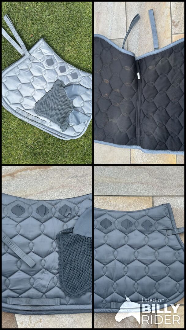 Podkładka pod siodło Eskadron VS Glossy Wave ashblue grey-blue warmblood set - Na sprzedaż mało używana podkładka pod siodło eventowe "Glossy Wave" firmy Eskadron w kolorze "ashblue" z pasującymi uszami muchy (nieużywanymi) firmy Eskadron w kolorze ashblue. Wszystkie WB.
