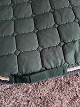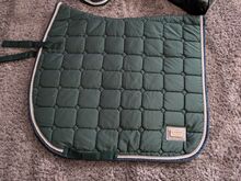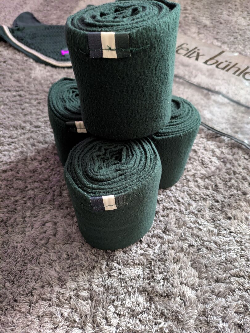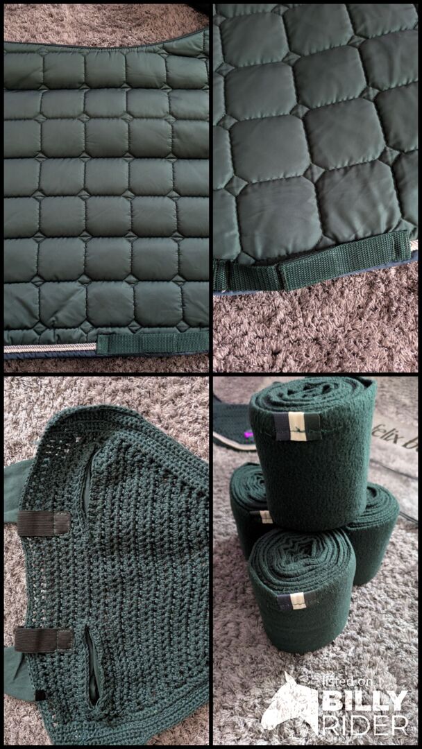 Podkładka pod siodło Felix Bühler Green Lake, zielona, zestaw Dr Dressage WB - Najlepszy stan, był na koniu tylko kilka razy i zawsze był traktowany z należytą starannością, co widać na zdjęciach. Maskę na muchy można przymocować do uzdy za pomocą rzepu, bandaże są zwinięte, dzięki czemu można je przymocować bezpośrednio do konia. (Jeden z nich owinąłem odwrotnie, aby można było zobaczyć zapięcie). Podkładka pod siodło jest również w doskonałym stanie, podobnie jak wszystkie inne elementy.
