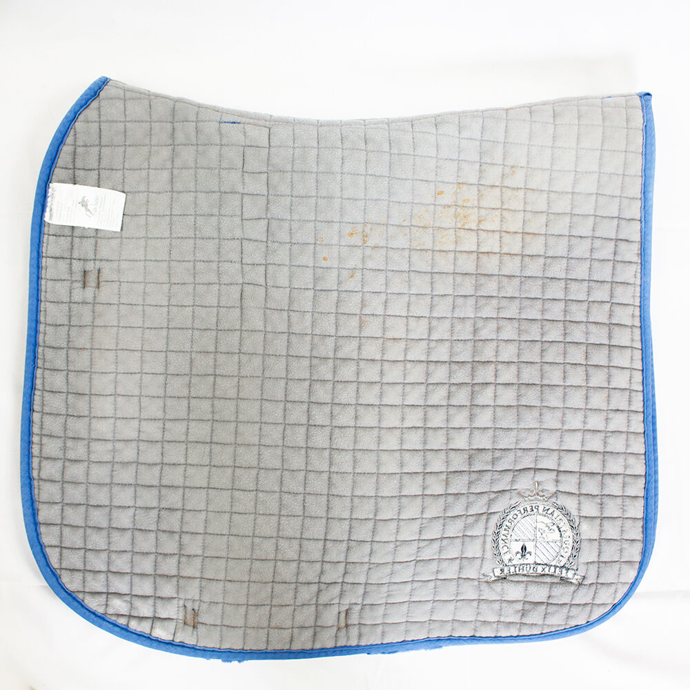 Podkładka pod siodło Felix Bühler niebieska DR - Piękna podkładka pod siodło ujeżdżeniowe firmy Felix Bühler. Piękna podkładka pod siodło treningowe ma niebieski kolor. Ma małe pikowanie i piękne logo Felix Bühler w rogu. W naszym sklepie dostępne są również pasujące bandaże i maska na muchy. Podkładka pod siodło nosi wyraźne ślady użytkowania. Krawędź pasa jest niestety uszkodzona, a kolor jest nieco wyblakły. To the seller's offerlaunch