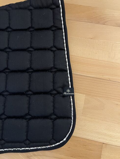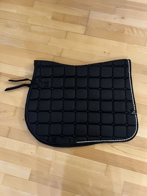 Sprzedaję bardzo ładną, mało używaną podkładkę pod siodło Felix Bühler w kolorze czarnym ze złotym cekinowym sznurkiem (bez brokatu). Po jednej stronie znajduje się również bardzo małe logo Felix Bühler (patrz zdjęcia) Stan bardzo dobry.