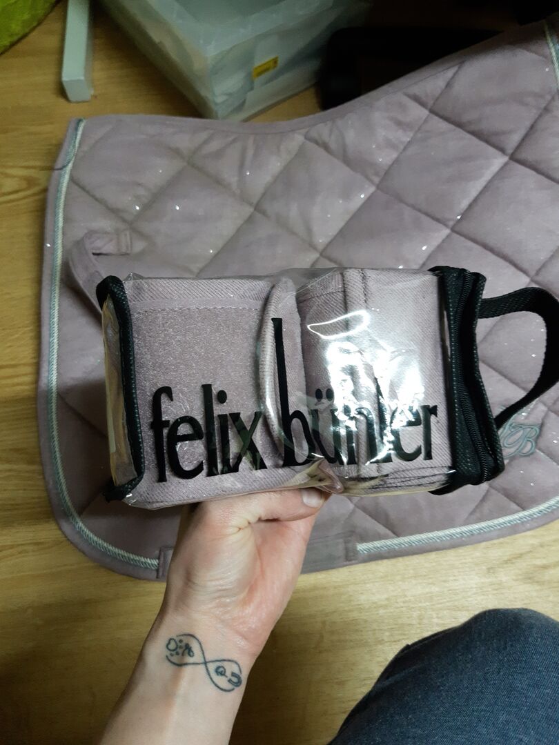 Podkładka pod siodło Felix Bühler z pasującymi bandażami - Sprzedam używaną podkładkę pod siodło w kolorze różowym z brokatem firmy Felix Bühler, posiada ślady użytkowania od siodła. Z pasującymi bandażami, które nigdy nie były używane