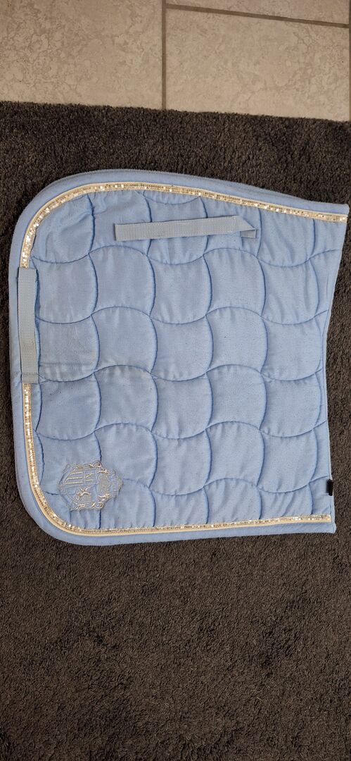 Podkładka pod siodło HV Polo z brokatowymi cekinami - Oferuję używaną, ale dobrze zachowaną podkładkę pod siodło ujeżdżeniowe firmy HV Polo. Podkładka ma niewielkie ślady po siodle, ale nie są one widoczne, gdy jest na koniu. Podkładka pod siodło ma błyszczącą cekinową lamówkę, została wyprana i wysuszona. Gospodarstwo domowe dla niepalących. Możliwa wysyłka. PayPal dostępny.