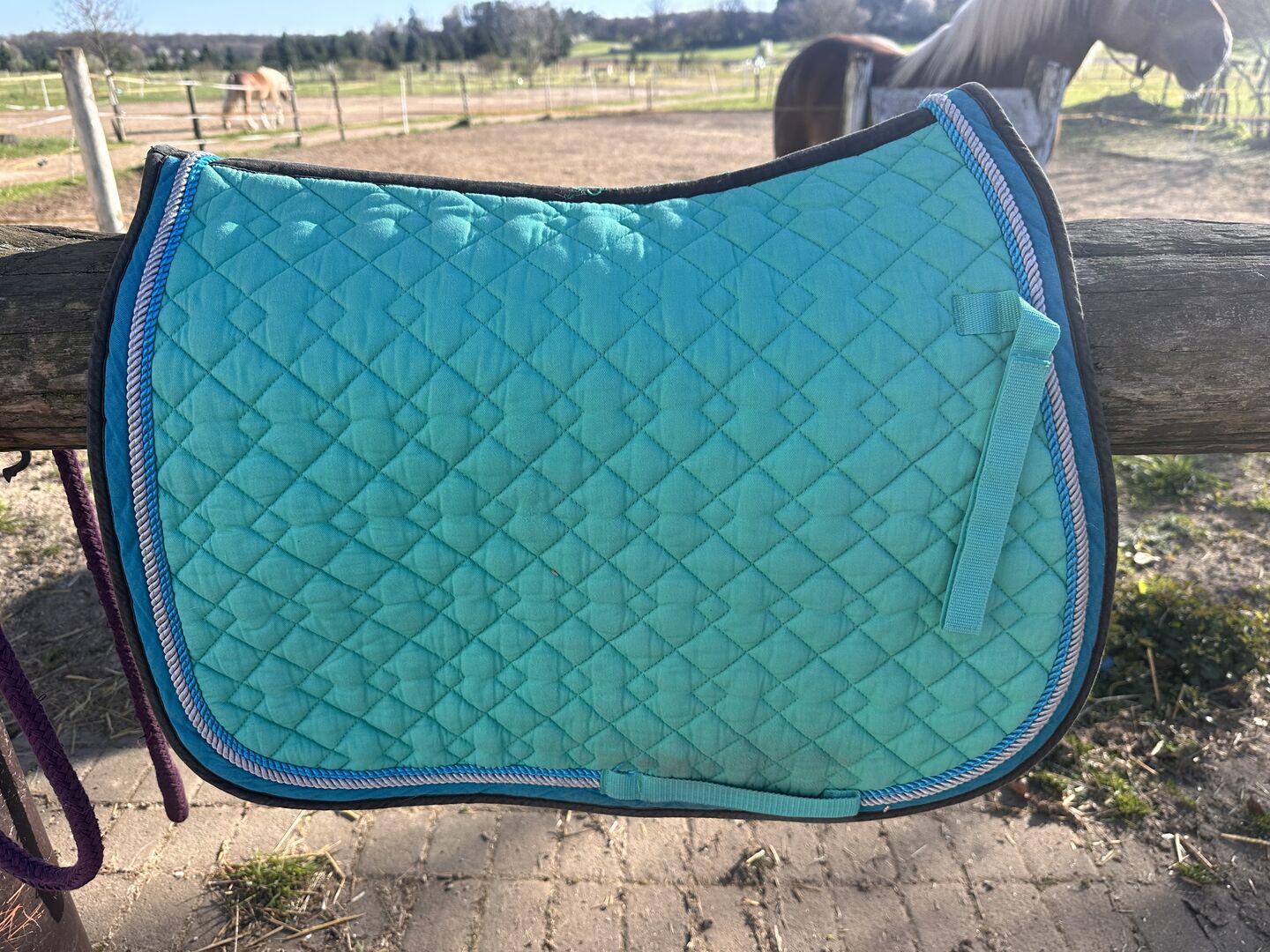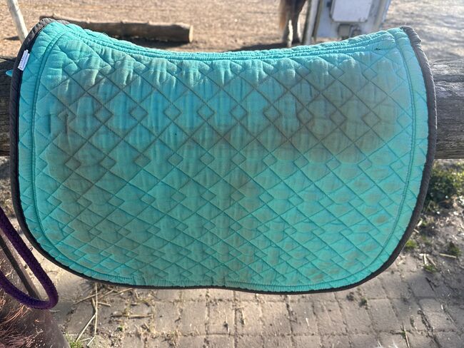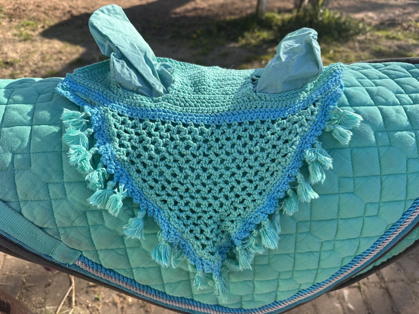 Podkładka pod siodło i maska na muchę - Sprzedaję podkładkę pod siodło ujeżdżeniowe, którą wystarczy tylko raz porządnie wyprać. Jest dostarczany z pasującą maską na muchy. Maska na muchy jest domowej roboty.