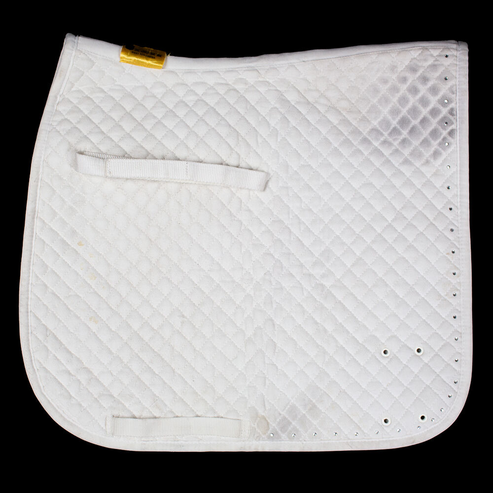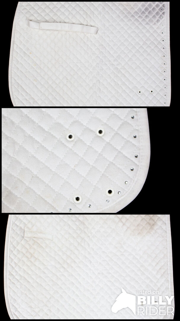 Podkładka pod siodło Kavalkade z oczkami na numery startowe biała PD - Ta piękna i klasyczna podkładka pod siodło ujeżdżeniowe dla kucyków firmy Kavalkade jest idealna jako podkładka pod siodło konkursowe dzięki praktycznym oczkom na numery startowe. Krawędź jest ozdobiona pięknymi, błyszczącymi kamieniami, dzięki czemu naprawdę przyciąga wzrok na wystawie. Biała podkładka pod siodło ma niestety lekkie odbarwienia na górnej i dolnej części oraz ogólne ślady zużycia. Brakuje kilku kamieni. To the seller's offerlaunch