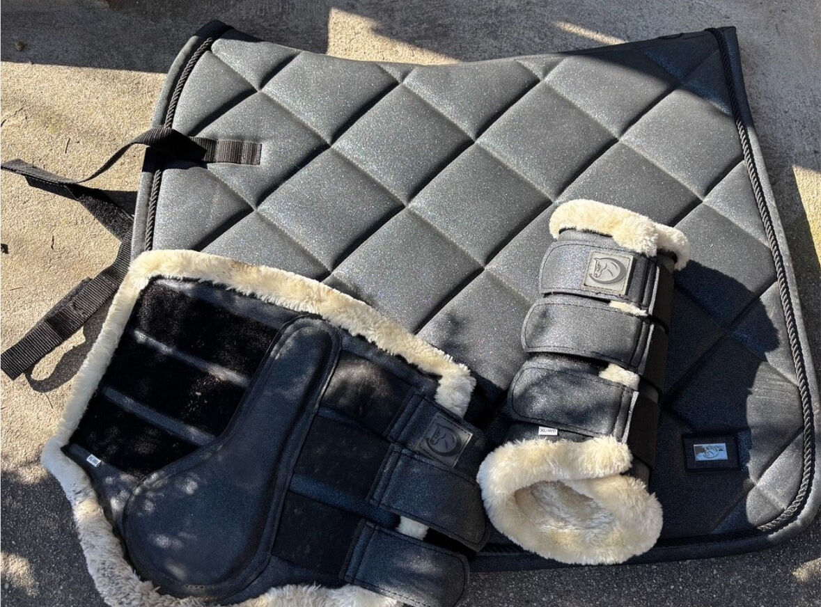Podkładka pod siodło na sprzedaż (zestaw z getrami) - Sprzedam podkładkę pod siodło z getrami. Jest w dobrym stanie. W razie zainteresowania lub pytań proszę o kontakt