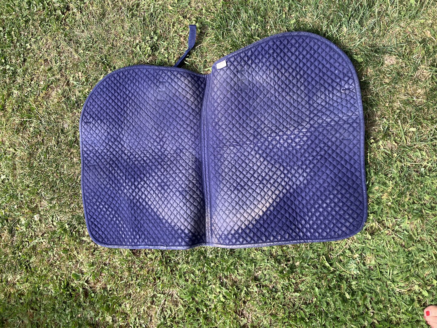 Podkładka pod siodło niebieska ze złotą krawędzią - Oferuję tutaj podkładkę pod siodło w kolorze niebieskim ze złotą krawędzią Wymiary: Długość grzbietu 58 cm Szerokość jednego boku podkładki 50 cm Sprzedaż prywatna - brak gwarancji - brak możliwości zwrotu