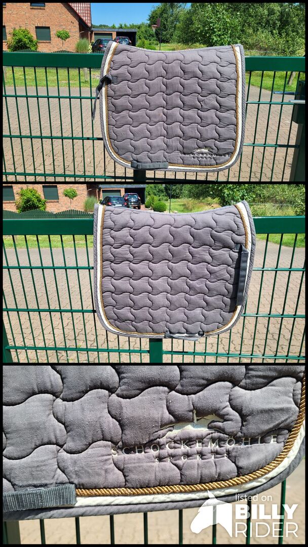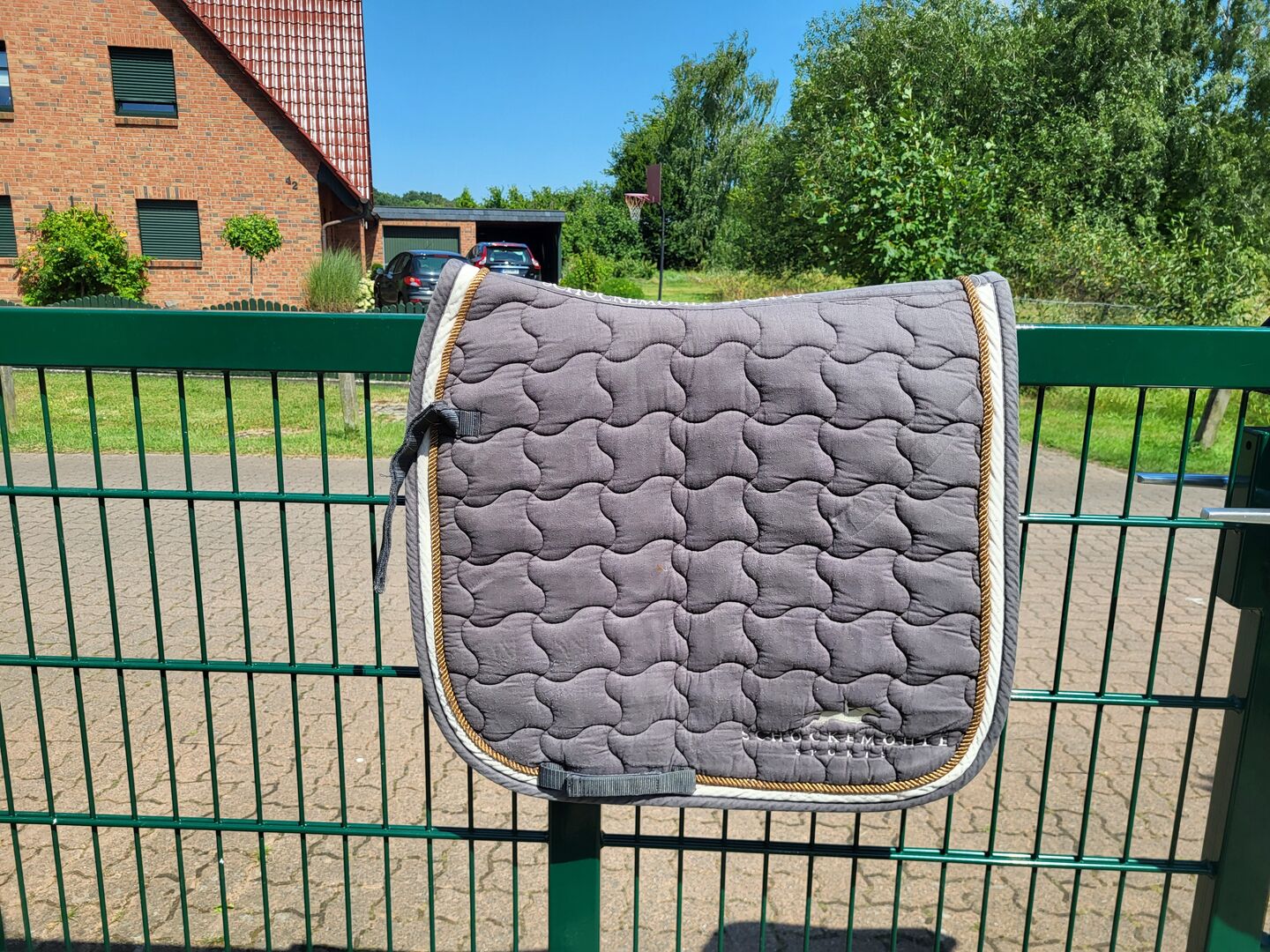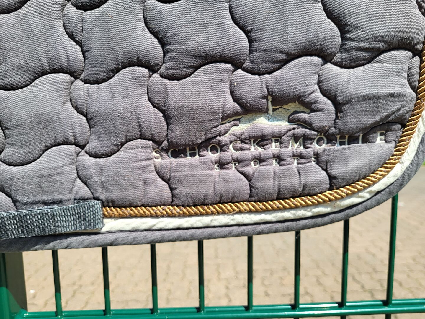 Oferuję bardzo używany pad od Schockemöhle Sports w kolorze szarym ze złotym sznurkiem. Z jednej strony jest mała, brązowawa plama, ale znika pod siodłem. Być może da się ją usunąć praniem.