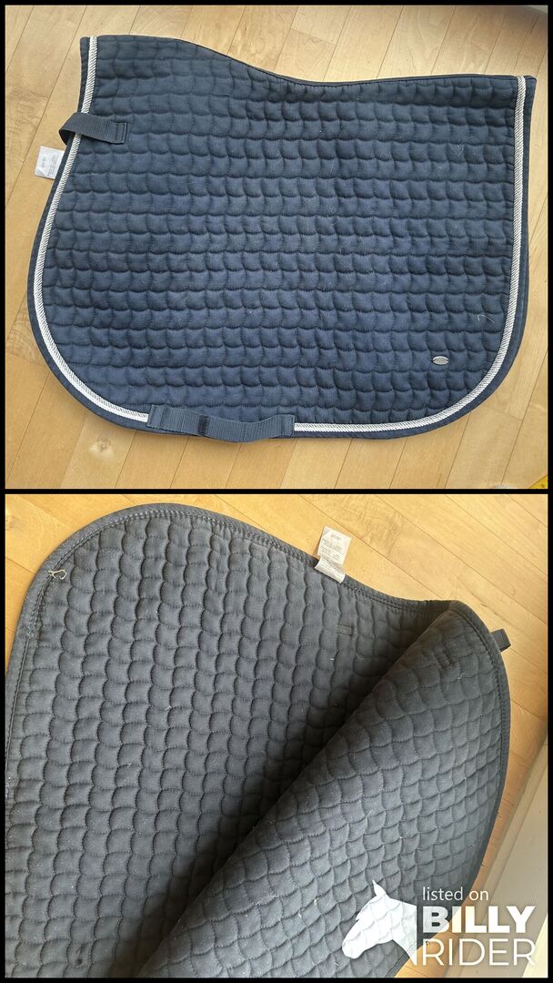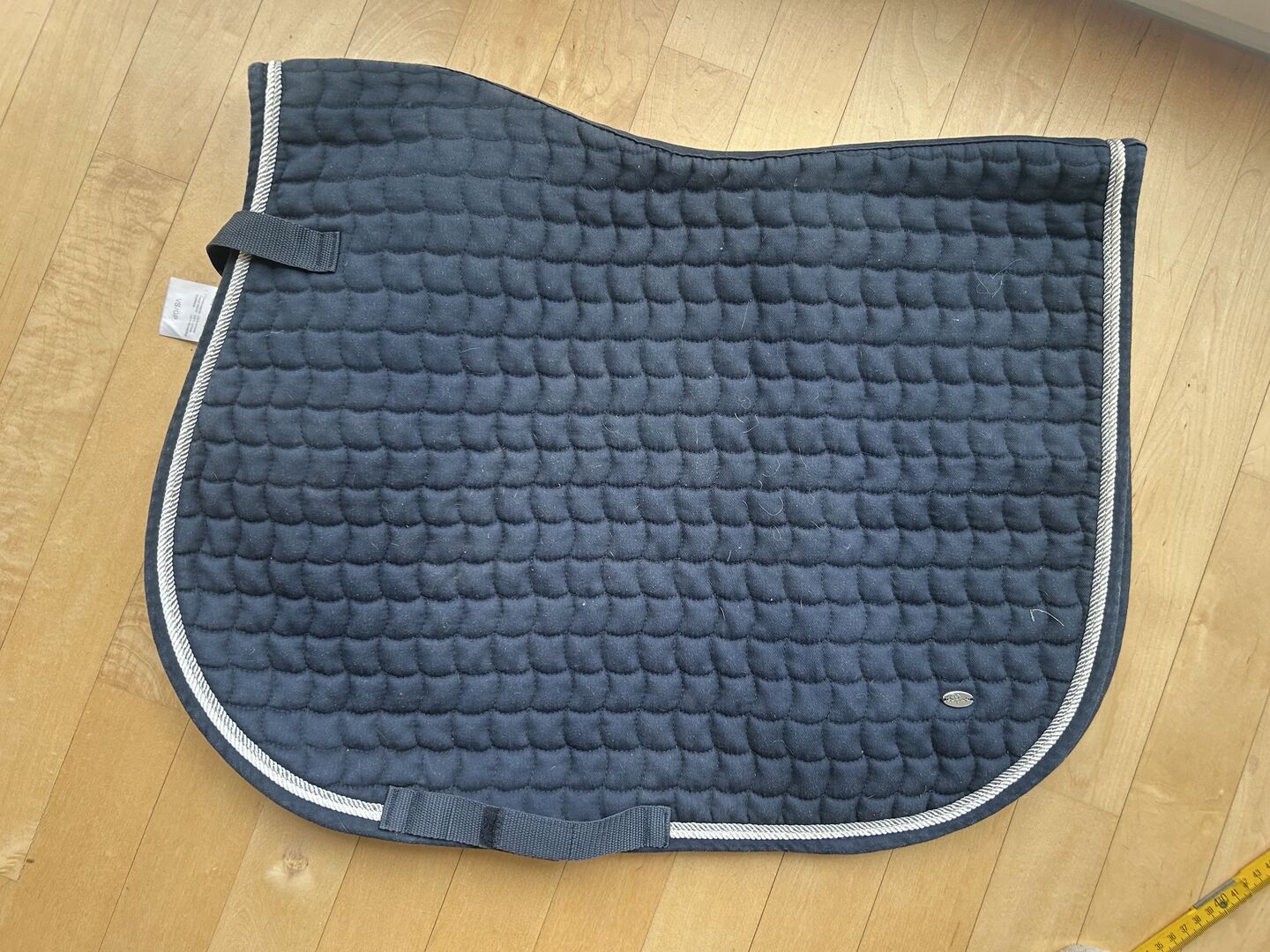 Podkładka pod siodło Showmaster Basic VS - Podkładka pod siodło Felix Bühler: Dyskretna, stabilna wymiarowo bawełniana podkładka pod siodło z minimalistycznym pikowaniem, wielokolorową lamówką w paski i filigranem, metalową płytką w kolorze srebrnym z dyskretnym grawerem logo. Pętle na siodło i popręg z praktycznymi KV. Spód wykonany z pochłaniającej wilgoć i oddychającej siateczki. Strona zewnętrzna 100% bawełna, wyściółka i spód 100% poliester.