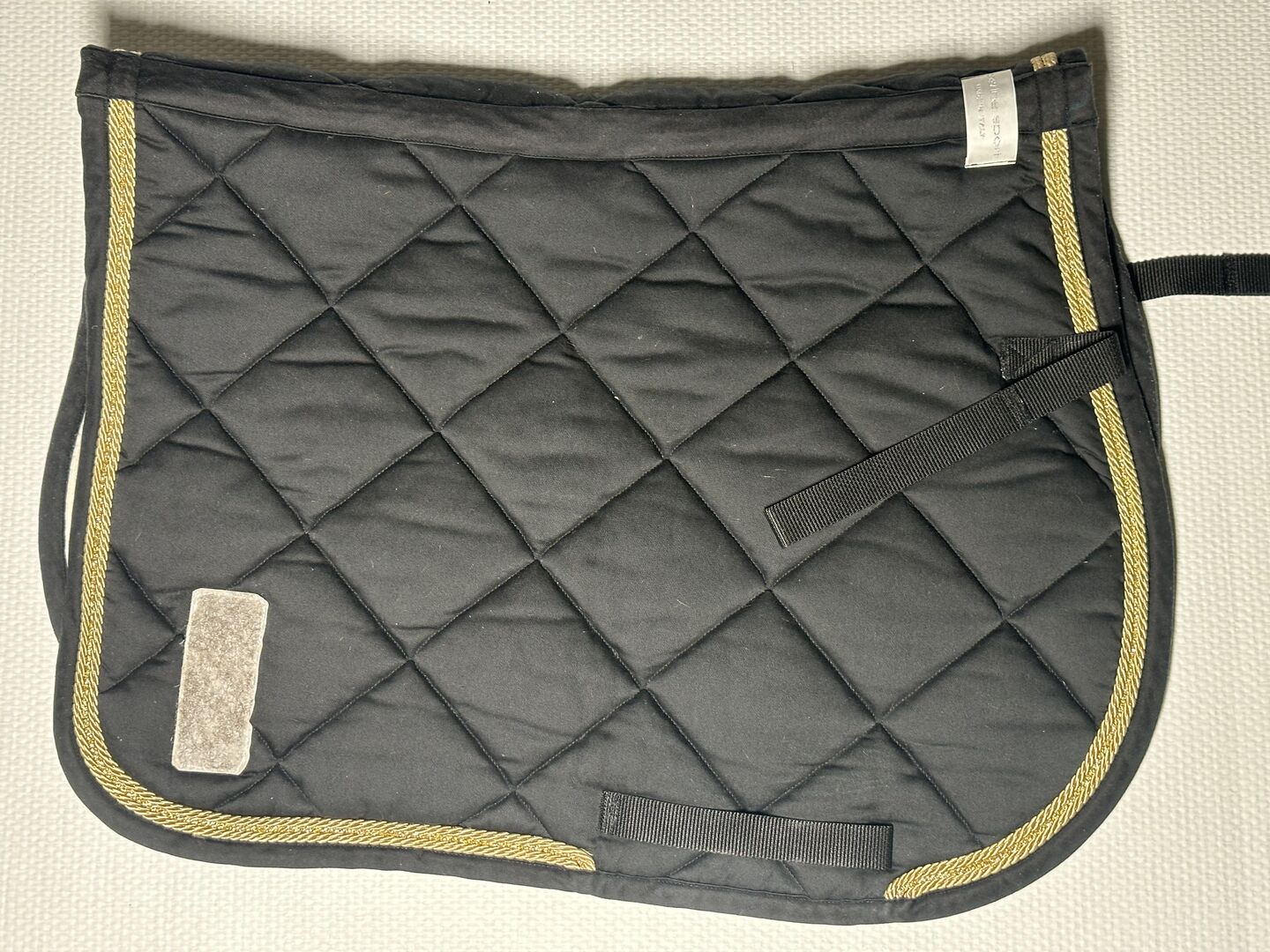 Podkładka pod siodło SPR czarno-złota z numerami startowymi - NOWOŚĆ - Nowa podkładka pod siodło, leżała na koniu tylko w celu przetestowania, w tym mocowanie numeru startowego na rzep, czarna z błyszczącym złotym sznurkiem