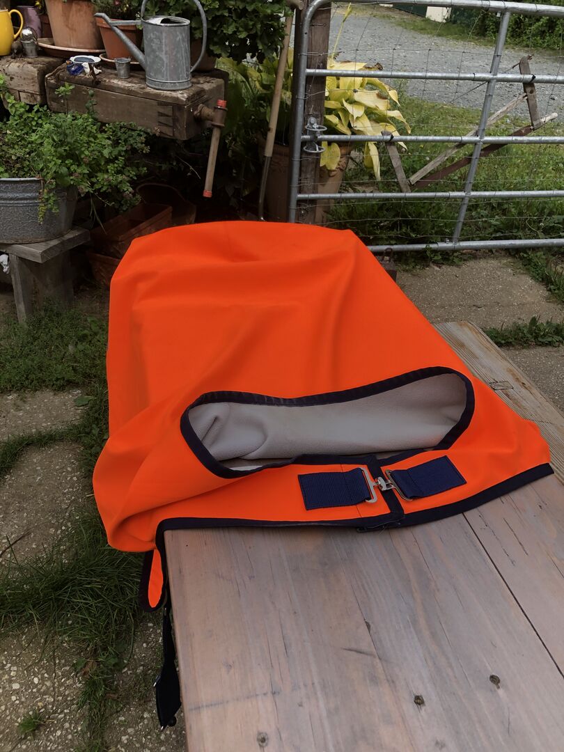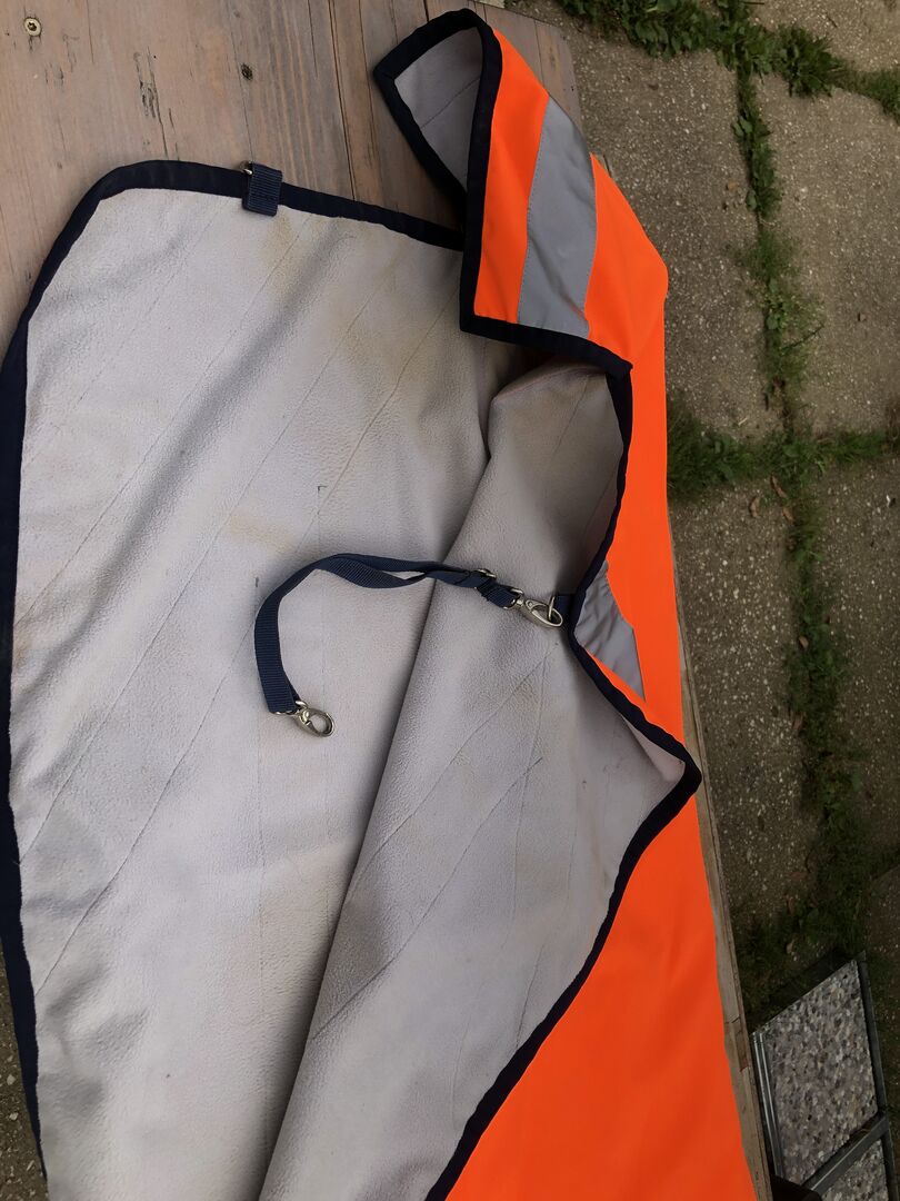 Podkładka pod siodło Sznur odblaskowy Sznur Shetty - Neonowo-pomarańczowa derka jeździecka marki Sonja Singer. Miękka powłoka na zewnątrz i przytulny polar wewnątrz. Z odblaskowymi paskami, wiatroszczelna i wodoodporna. Był używany tylko raz, kilka włosków wewnątrz, niewielkie ślady użytkowania na zewnątrz, które można bezpiecznie wytrzeć wilgotną szmatką, poza tym jak nowy. Wymiary patrz zdjęcia. Oryginalna cena 49