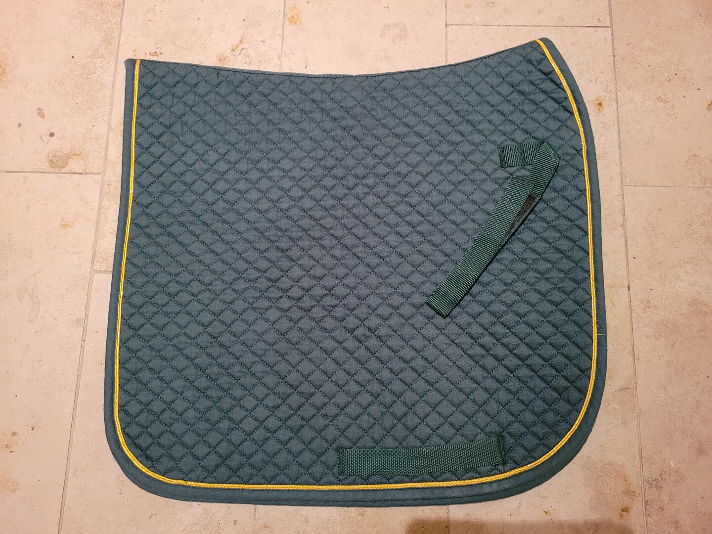 Podkładka pod siodło / tkanina pod siodło zielono/złota, kucyk - Oferuję używaną podkładkę pod siodło / materiał na siodło w kolorze ciemnozielonym ze złotą obwódką
