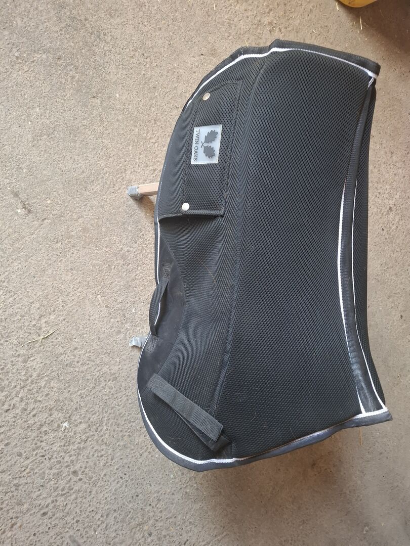 Podróżna podkładka pod siodło wykonana z oddychającego materiału siatkowego. Wzmocnienia na popręgu i kłębie. Materiał absorbujący wstrząsy z tyłu. Dwie naszywane kieszenie.
