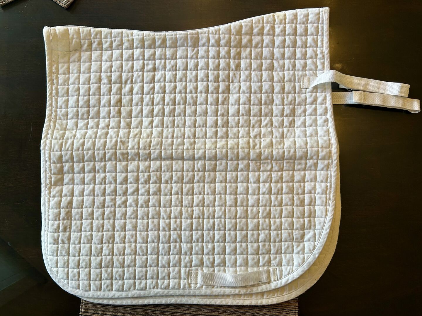 This dressage saddle pad is in excellent condition. It was used once. It is perfect for showing. Length-22” Width- 22”. Velcro straps to connect to saddle.