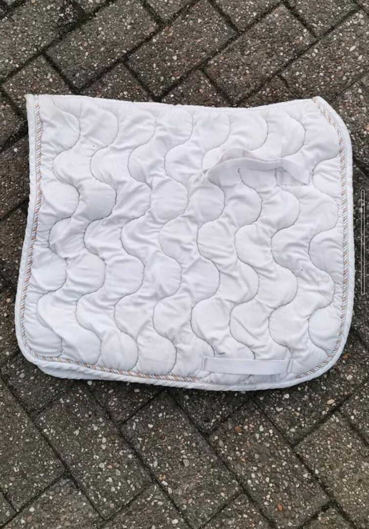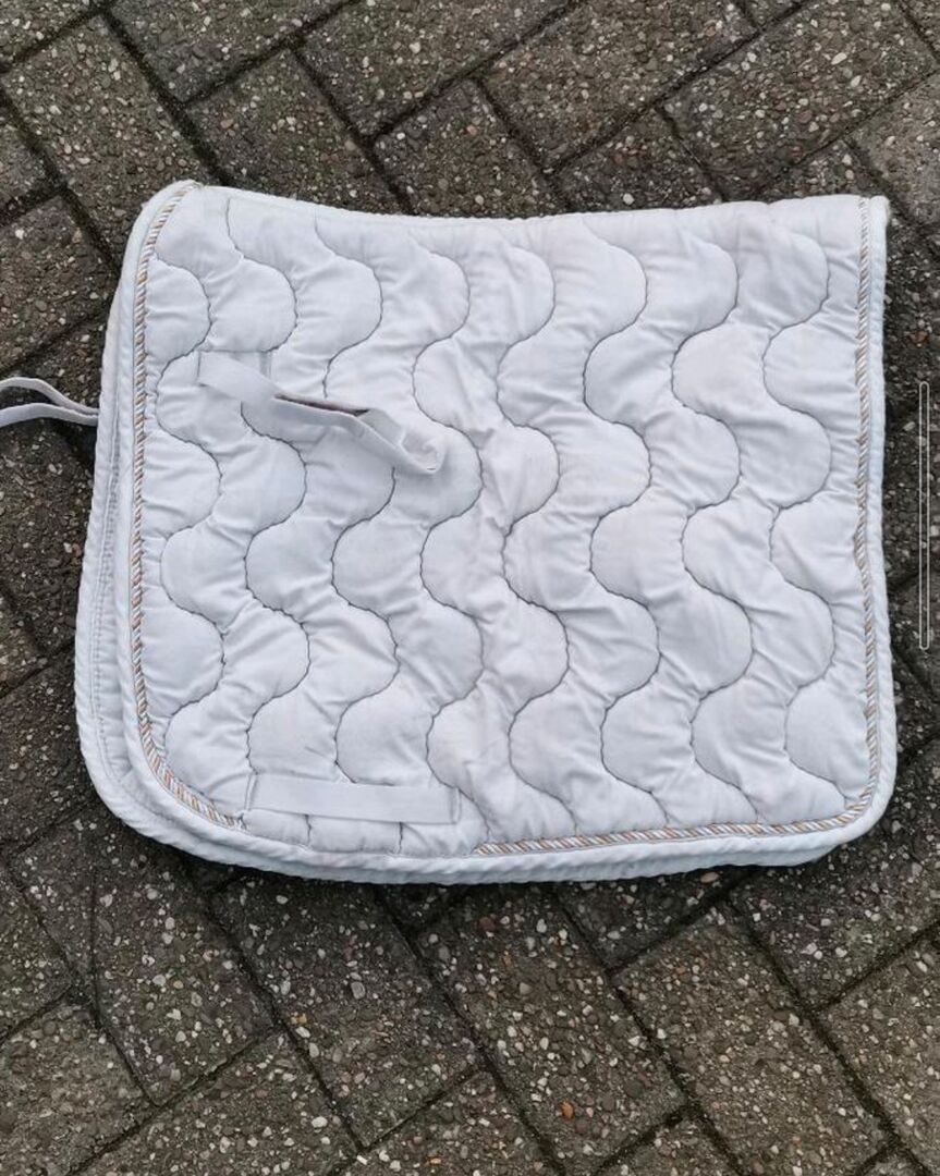 Podkładka pod siodło ujeżdżeniowe biała WB - Na sprzedaż białe siodło konkursowe w rozmiarze WB do ujeżdżenia. W dobrym stanie, szczegóły na zdjęciach. Rzepy nadal mocno trzymają, a podkładka pod siodło nie ma dziur ani podobnych elementów. Małe czarne przebarwienie po prawej stronie popręgu.