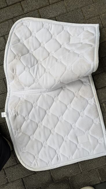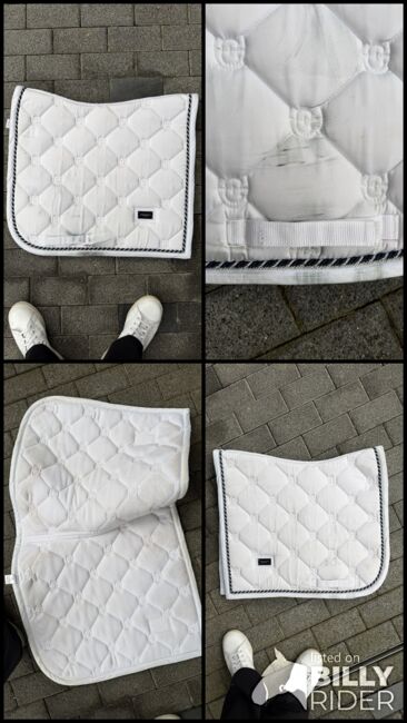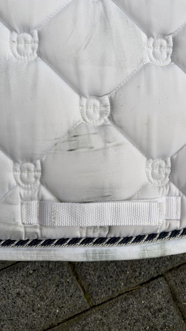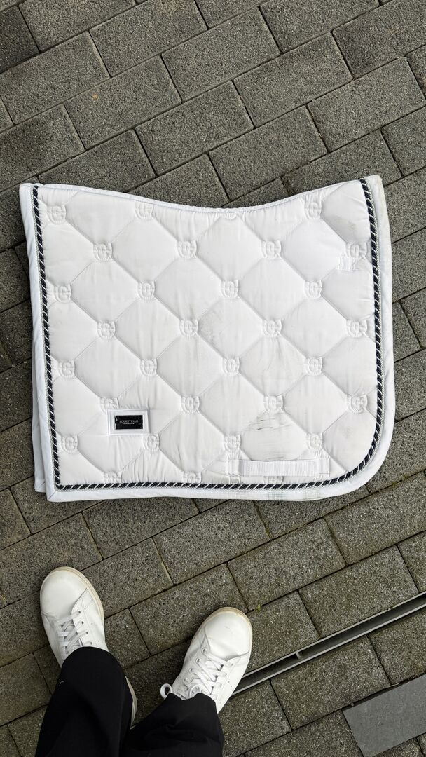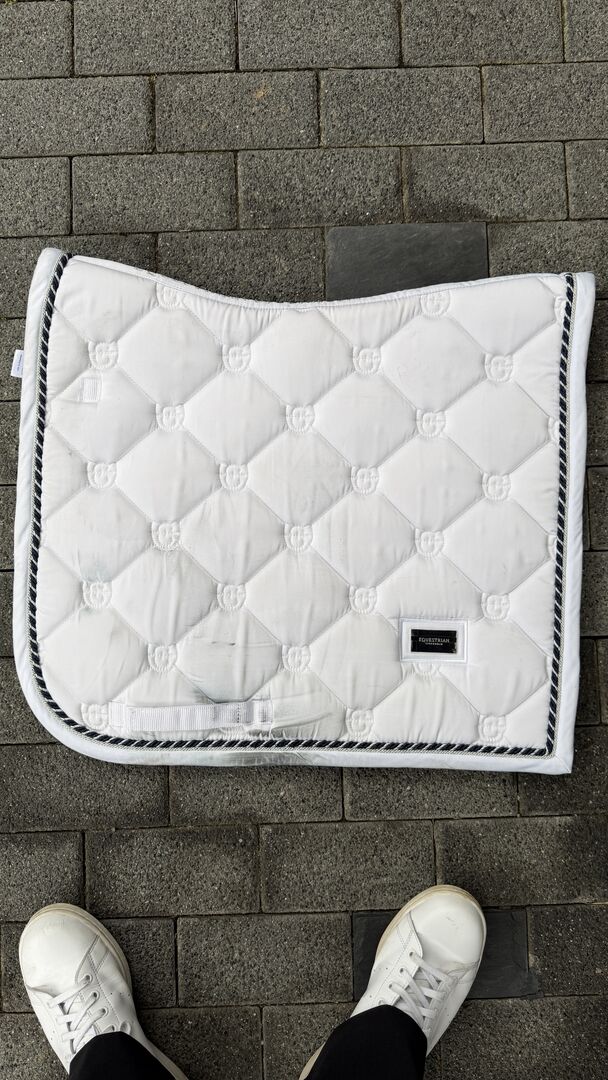 Podkładka pod siodło ujeżdżeniowe Equestrian Stockholm - Sprzedaję podkładkę pod siodło pokazowe firmy equestrian stockholm. Podkładka ma niewielkie ślady użytkowania (odbarwienia od siodła) i była noszona kilka razy (tylko na pokazie)