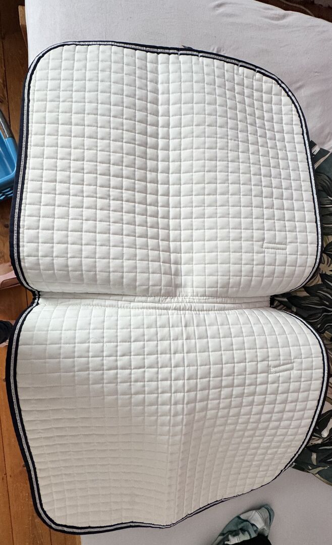 Podkładka pod siodło ujeżdżeniowe pełna - Piękny i bardzo duży pad pod siodło. Z ciemnoniebieską i srebrną lamówką. Nowy i nieużywany. Niestety mała plama (patrz zdjęcie), która na pewno zejdzie po praniu.