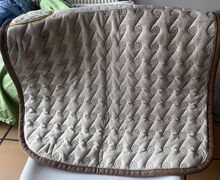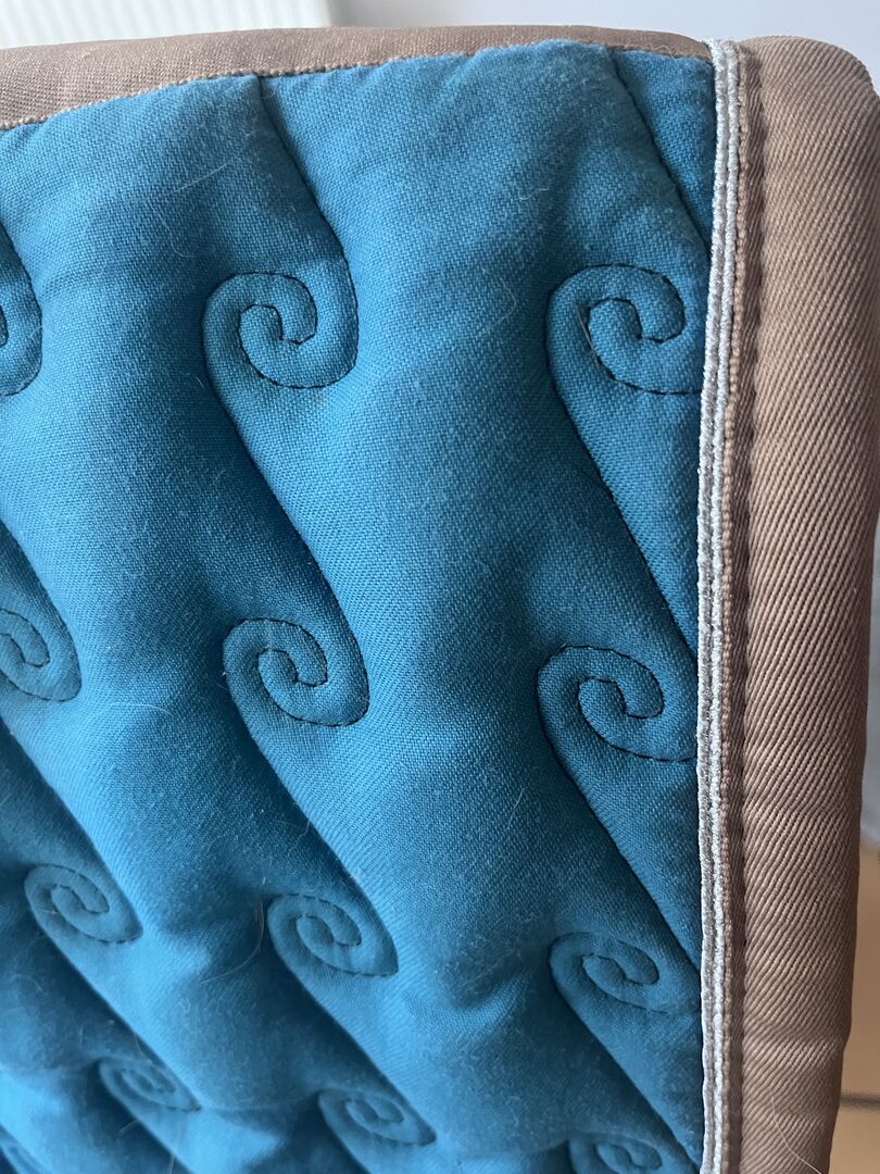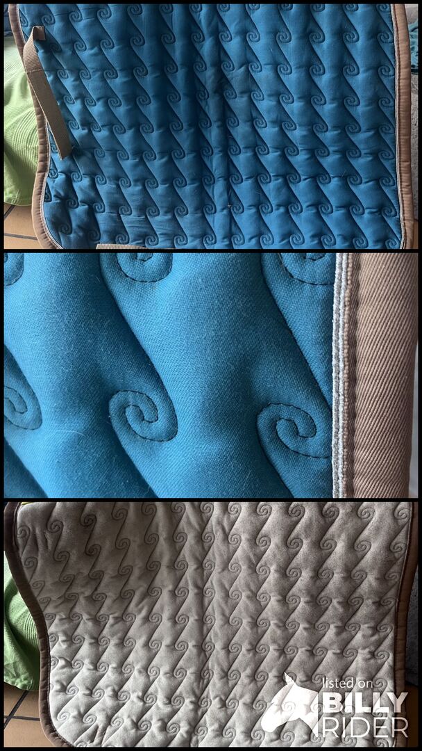 Podkładka pod siodło ujeżdżeniowe, turkusowo-brązowa ze srebrnym wykończeniem - Podkładka pod siodło ujeżdżeniowe w kolorze turkusowym/brązowym ze srebrnym wykończeniem - patrz szczegółowe zdjęcie. Koc jest świeżo wyprany, włosy są nadal obecne.