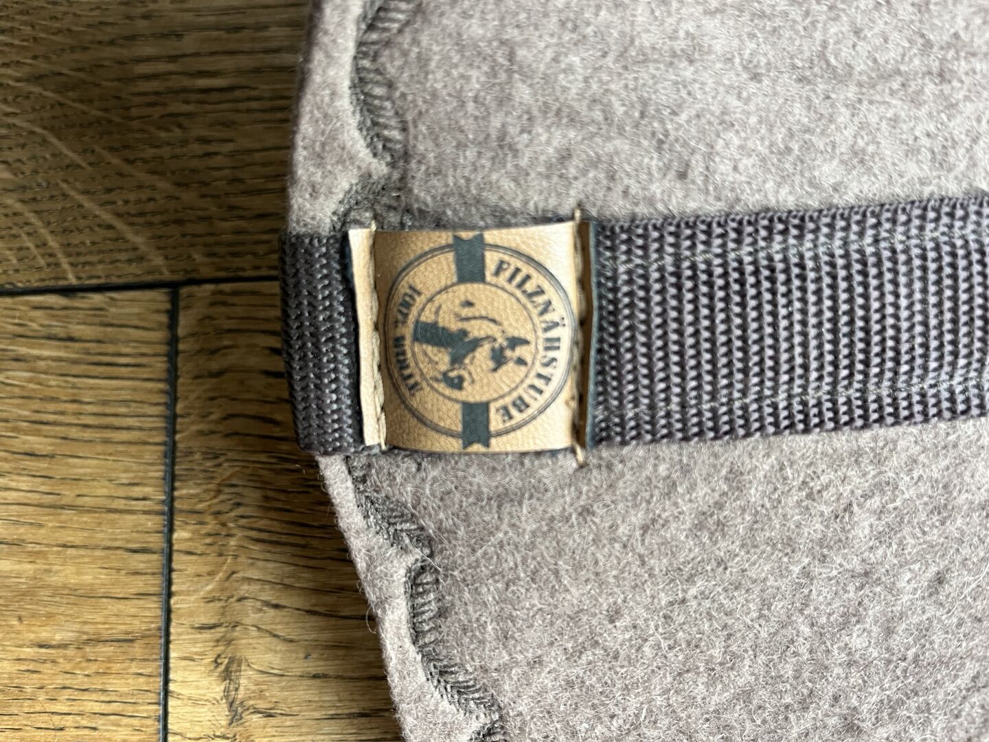 Podkładka pod siodło z filcu wełnianego (od Filznähstube) - Podkładka pod siodło z filcu wełnianego (z Filznähstube) Krój wytrzymałościowy, długość ok. 65 cm Kolor filcu nugatowy Haft i górny pasek w kolorze brązowym Stan: mało używany, wstępnie wyczyszczony - nie prany