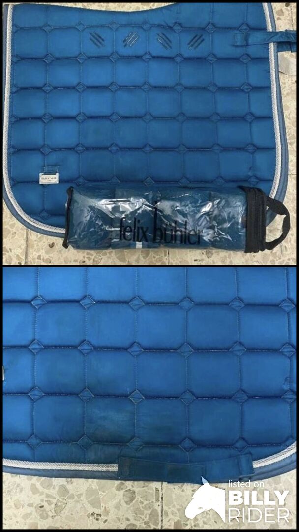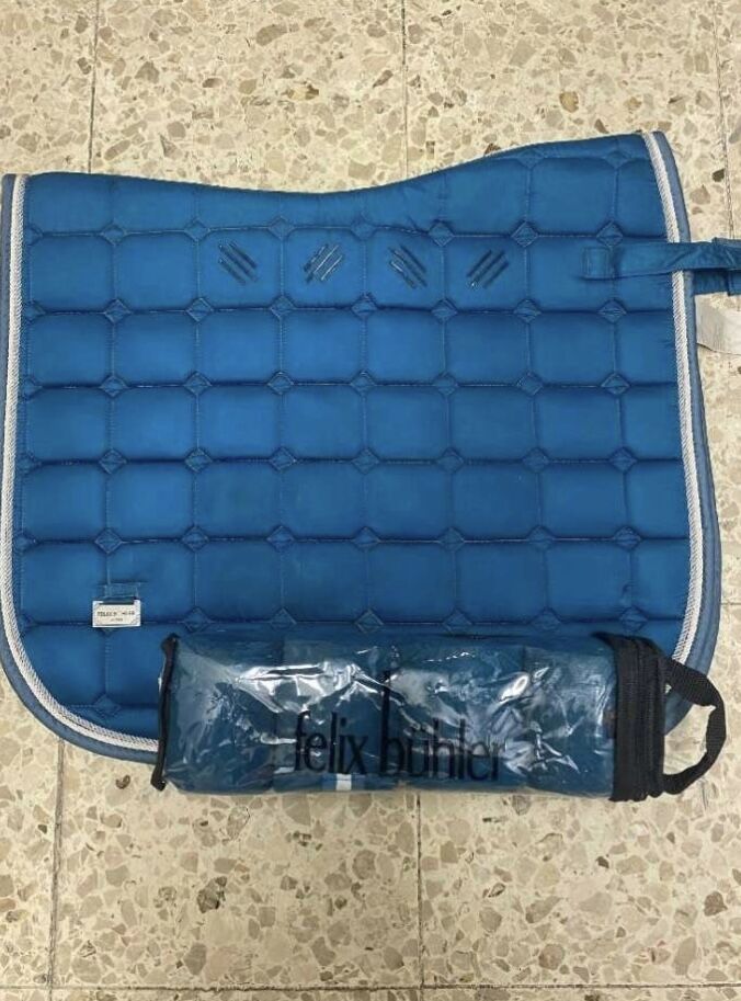 Podkładka pod siodło z getrami - Niebieski zestaw: podkładka pod siodło, 4 bandaże 60€ Jest prawie jak nowy, tylko podkładka pod siodło jest trochę brudna na dole z powodu butów podczas jazdy. Sprzedaż prywatna, bez gwarancji i rękojmi.