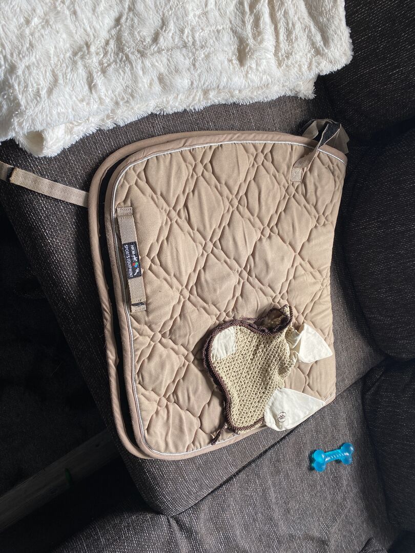 Podkładka pod siodło z maską na muchy - Jasnobrązowa podkładka pod siodło z dopasowaną maską na muchy. Oba prawie nieużywane oraz świeżo umyte i zdezynfekowane.