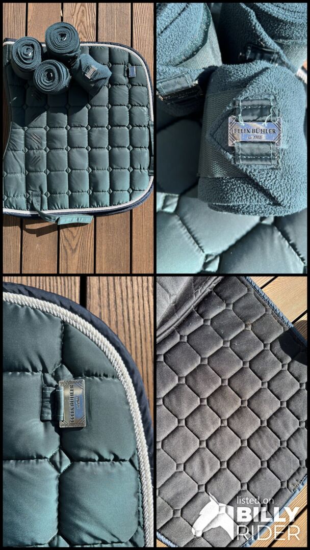 Podkładka pod siodło z pasującymi bandażami - Sprzedaję podkładkę pod siodło wraz z pasującymi bandażami od Felixa Bühlera. Kolor Green Lake Rozmiar WB Był używany z przyjemnością, ale nie ma żadnych wad.