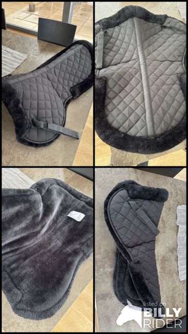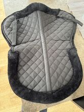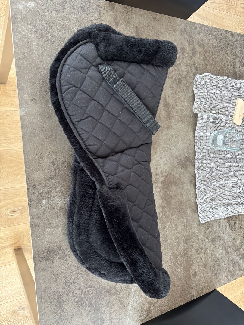 Podkładka pod siodło z syntetycznej skóry jagnięcej - Podkładka pod siodło ujeżdżeniowe full - na siodło 17,5 / 18 cali Nowy - tylko raz założony na konia, nie jeżdżony (był dla nas za duży) ... Czarny, wykonany z przytulnego pluszowego polaru (sztuczna skóra jagnięca) i pętli na rzepy do mocowania do siodła.